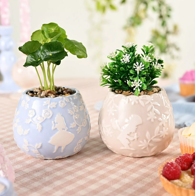Setzen Sie mit diesen dekorativen Minitöpfen in Creme-Beige und Hellblau elegante Akzente und bringen Sie die Magie von „Alice im Wunderland“ in Ihr Zuhause – ganz ohne grünen Daumen