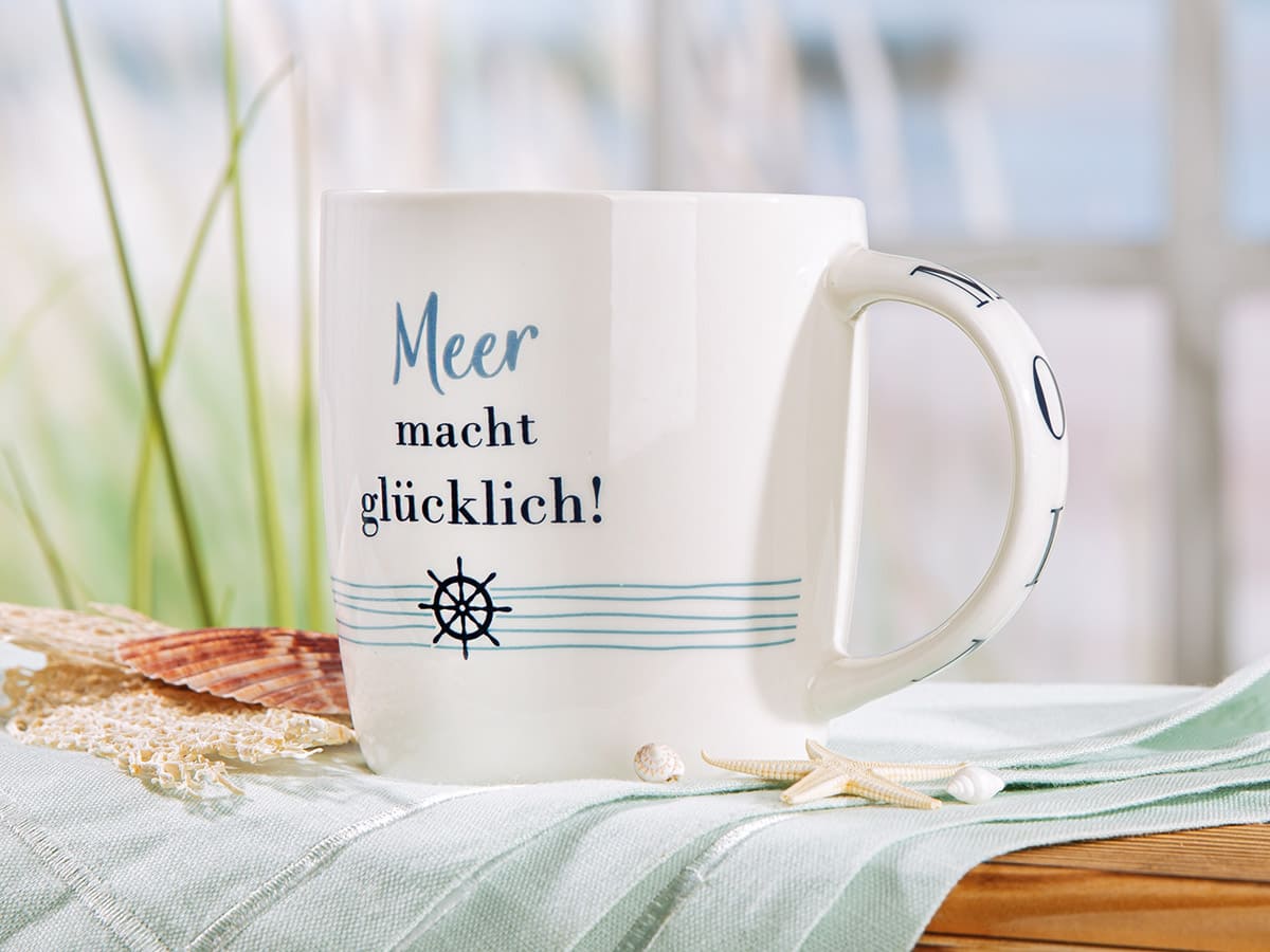 Der Becher „Wellenglück“ von Gilde Handwerk ist ein echtes Highlight für alle, die das Meer lieben. Mit dem stilvollen Schriftzug „Meer macht glücklich“, dem Steuerrad und den blauen Wellen bringt dieser Becher einen Hauch von Küstenflair in deinen Alltag. Besonders schön ist der Schriftzug Moin auf dem Henkel, der so für noch mehr maritimen Charme sorgt. Ideal für alle, die das Meer im Herzen tragen.