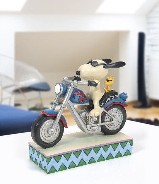 Snoopy und Woodstock spüren den Fahrtwind in ihren Gesichtern, während sie auf einem Motorrad die Straße entlangfahren. Dieses handgefertigte und handbemalte Stück ist Teil der Peanuts-Kollektion von Jim Shore und verkörpert den Spaß und die Freiheit der offenen Straße.