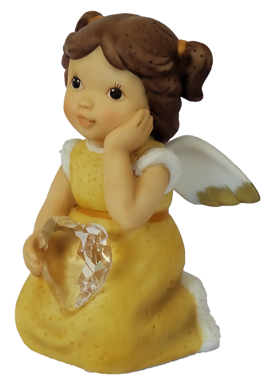 - Design: Kniender Engel in gelbem Gewand, hält ein Herz