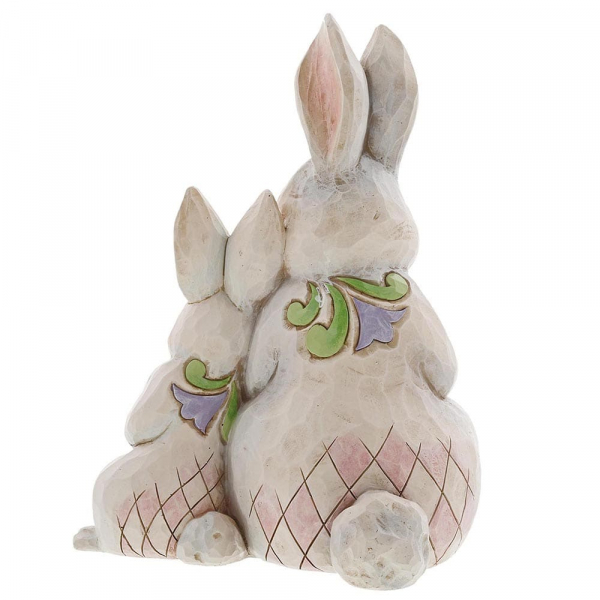 • Folkloristisches Design – Die Hasen tragen traditionelle, handbemalte Muster, die den rustikalen Charme von Jim Shore betonen