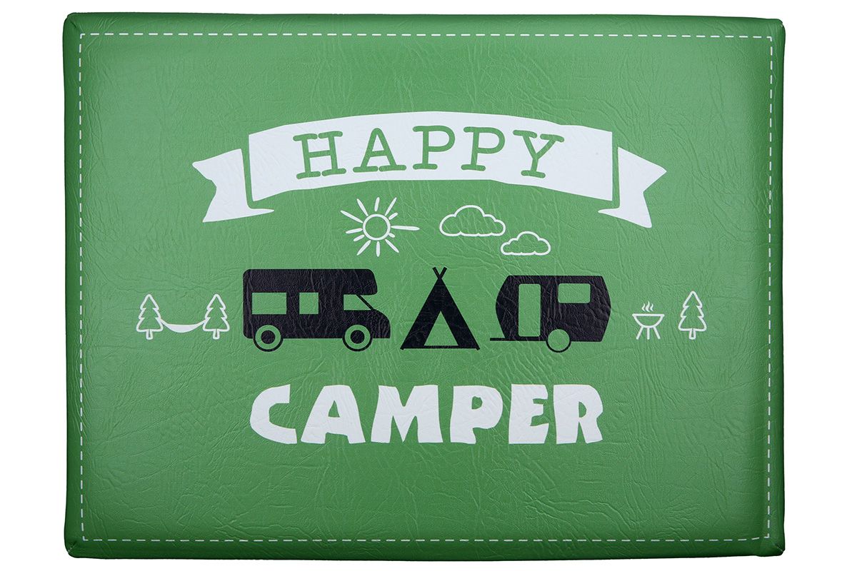 Gilde Sitzpolster „Happy Camper“ – bequem, praktisch und ein Muss für Outdoor-Fans - Modern, funktional und der perfekte Begleiter für jedes Camping-Abenteuer: Das grüne Sitzkissen „Happy Camper“ mit dem fröhlichen Schriftzug und den liebevoll gestalteten Motiven eines Campers, Zelts und eines Wohnwagens macht jede Outdoor-Party oder jedes Festival zu einem gemütlichen Erlebnis. Das Kissen ist nicht nur ein Hingucker, sondern auch ein bequemer Sitzplatz, der sich einfach transportieren und bei Bedarf schnell aufbauen lässt.