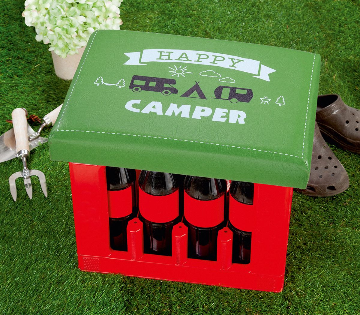 Verwandeln Sie jede Getränkekiste in einen gemütlichen Sitzplatz und bringen Sie etwas Camping-Flair auf Ihre Partys, Festivals oder zum nächsten Ausflug – mit dem Gilde Sitzpolster „Happy Camper“