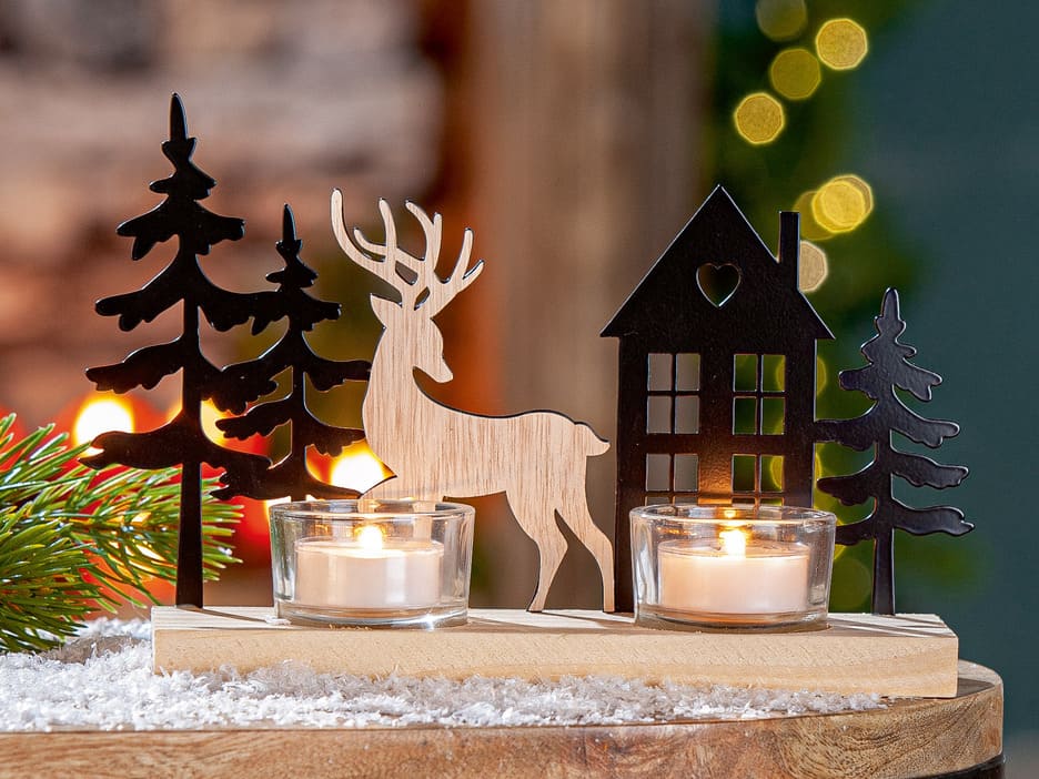 Der Teelichtleuchter „Vado“ von Gilde bringt mit seinem rustikalen Design winterliche Gemütlichkeit in Ihr Zuhause. Auf einer natürlichen Holzplatte sind zwei Teelichthalter integriert, die stimmungsvolles Kerzenlicht verbreiten. Im Hintergrund thront ein stilisierter Hirsch bzw. Elch aus Holz, der das Motiv der Winter- und Waldzeit perfekt unterstreicht. Links davon stehen zwei unterschiedlich hohe, schwarze Metalltannen, rechts ein schwarzes Haus mit einem herzförmigen Giebel und daneben eine weitere Metalltanne – alles harmonisch arrangiert für eine behagliche Atmosphäre. Dieses Dekostück eignet sich ideal als stimmungsvolle Tisch- oder Fensterbank-Deko in der kalten Jahreszeit und verleiht jedem Raum einen charmanten, naturnahen Look.