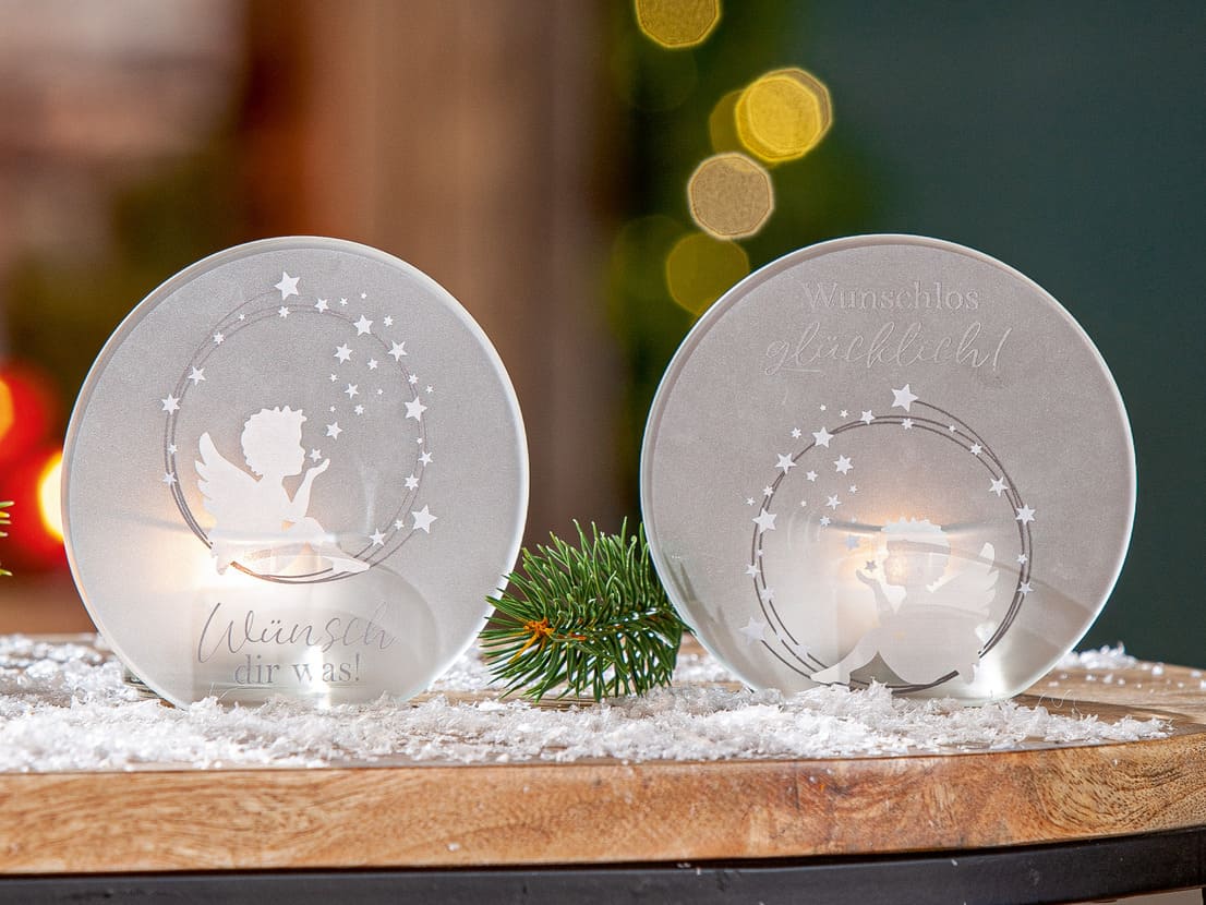 Der bezaubernde Teelichtleuchter „Engelszauber“ aus satiniertem Glas verbreitet eine warme und magische Atmosphäre. Der liebevoll gestaltete Leuchter zeigt einen sitzenden Engel, der einen Stern in der Hand hält, umgeben von weiteren funkelnden Sternen. Der Schriftzug „Wunschlos glücklich“ am oberen Rand macht den Teelichtleuchter zu einem besonderen Dekostück – perfekt für gemütliche Abende oder als Geschenk mit Herz. Das runde Glas misst 14,2 cm in der Höhe und hat einen Durchmesser von 15 cm. Hinter dem Glas befindet sich der Teelichthalter, der das Licht sanft durch das satinierte Glas und die silbernen sowie weißen Akzente strahlen lässt. Ein stimmungsvoller Blickfang für Fensterbank, Tisch oder Regal – besonders passend zur Winter- und Weihnachtszeit.