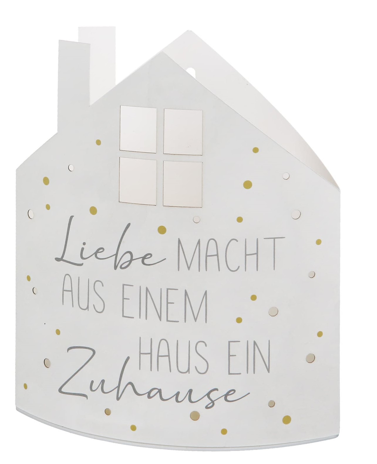 Diese liebevoll gestaltete Tischleuchte in Hausform von Gilde Handwerk bringt Wärme und Geborgenheit in jeden Raum. Die Aufschrift „Liebe macht aus einem Haus ein Zuhause“ erinnert an das, was wirklich zählt – einen Ort zum Wohlfühlen. Die Papplampe ist wie ein kleines Häuschen geformt, mit Schornstein, einem beleuchteten Dachfenster und zahlreichen feinen Lichtpunkten, die beim Einschalten ein zauberhaftes Lichtspiel erzeugen. Perfekt für Fensterbank, Sideboard oder Nachttisch – als stimmungsvolle Deko, Nachtlicht oder Geschenkidee.