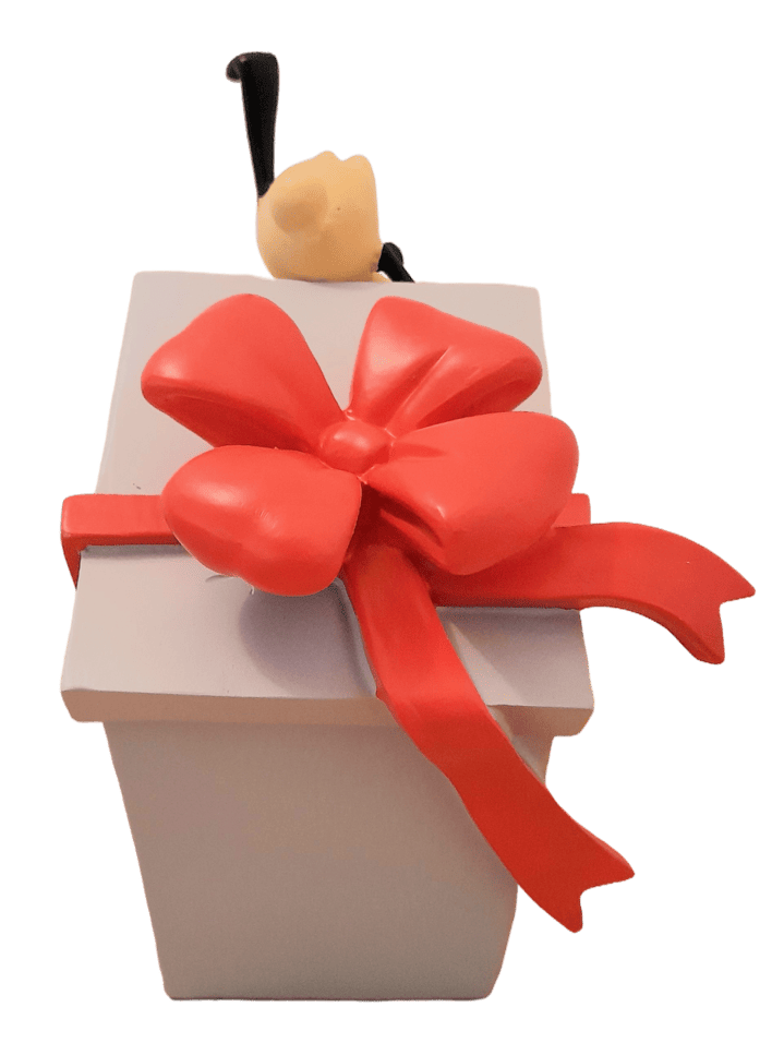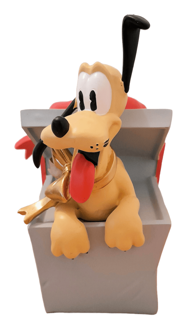 Diese liebevoll gestaltete Disney Weihnachtsfigur zeigt Pluto mit einer goldenen Schleife, wie er neugierig aus einer festlich dekorierten Geschenkschachtel mit roter Schleife blickt. Die ca. 20 cm große Figur aus hochwertigem Resin ist handbemalt und begeistert mit detailreicher Verarbeitung und strahlenden Farben.