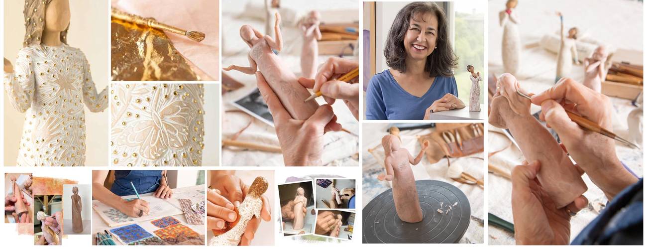 Hier beginnt die Magie: Jede Willow Tree® Figur entsteht Schritt für Schritt in Susan Lordis Atelier. Mit Ton, Spatel und Messer formt sie jedes Detail – Haare, Hände, Gewänder. Mit dem Bleistift zeichnet sie Muster, setzt goldene Akzente und glättet die Oberflächen. Aus diesen handgeschnitzten Originalen entstehen die Figuren, die wir kennen und lieben. Jedes Stück wird sorgfältig von Hand bemalt – jedes Detail trägt Susan Lordis persönliche Handschrift.