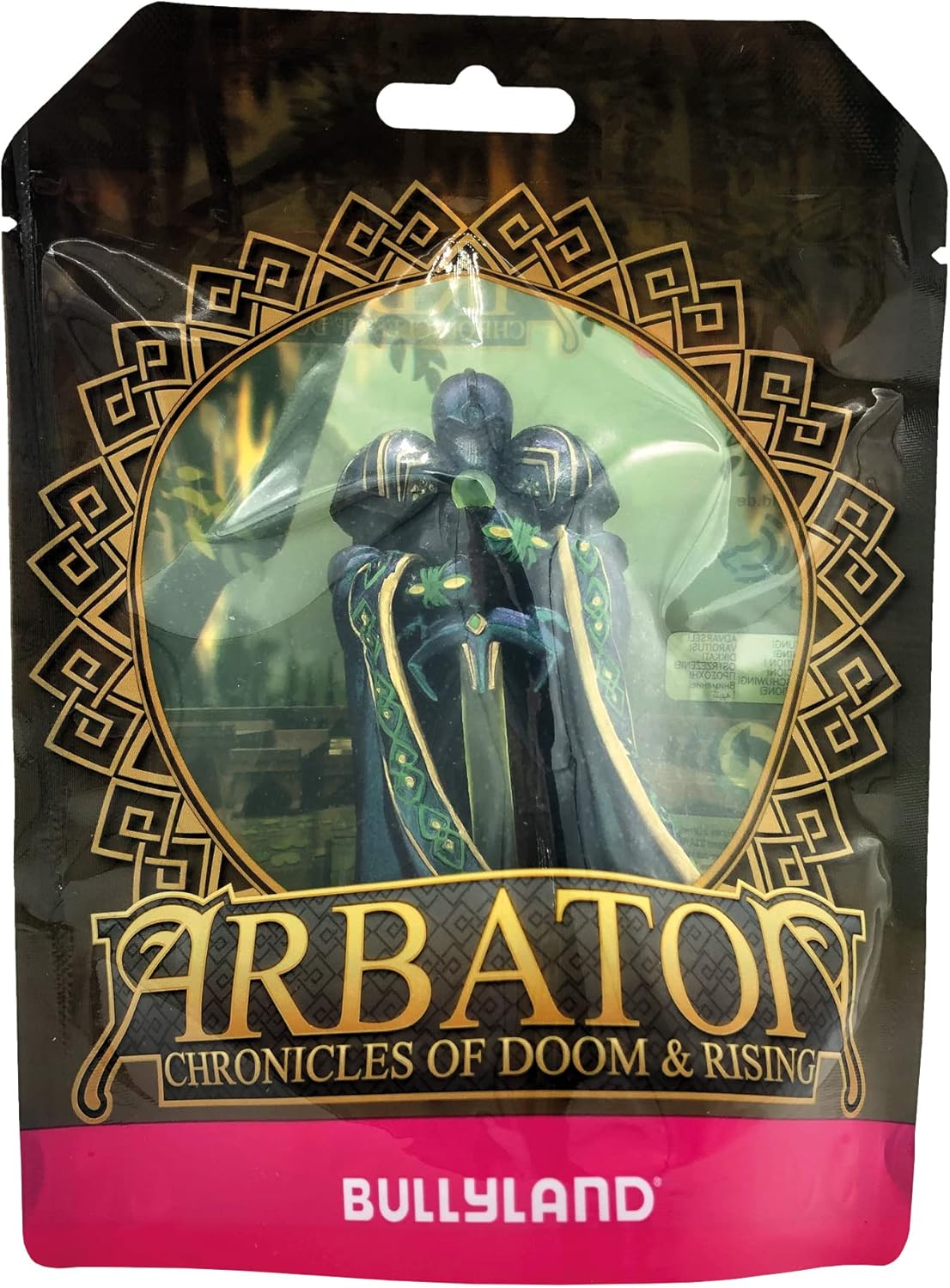 Der dunkle Fürst Mertor ist eine beeindruckende Figur aus der epischen Fantasy-Reihe Arbaton von Bullyland. Als furchterregender Herrscher des Königreichs Mormatar strahlt er Macht und Dunkelheit aus. Mit seinem langen schwarzen Mantel, der mit grünem Akzent verziert ist, und dem bedrohlichen Helm, der sein düsteres Gesicht verbirgt, verkörpert Mertor das Böse in seiner reinsten Form. In seiner Hand hält er ein großes, hellgrünes Schwert, das seine unaufhaltsame Macht symbolisiert.