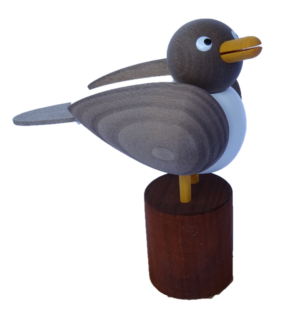 - Design: Möwe auf Holzpoller in Grau mit weißer Brust