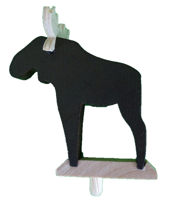 - Design: Dunkelbrauner Elch mit Geweih aus hellem Holz, in eine Kerbe gesetzt für einen 3D-Effekt