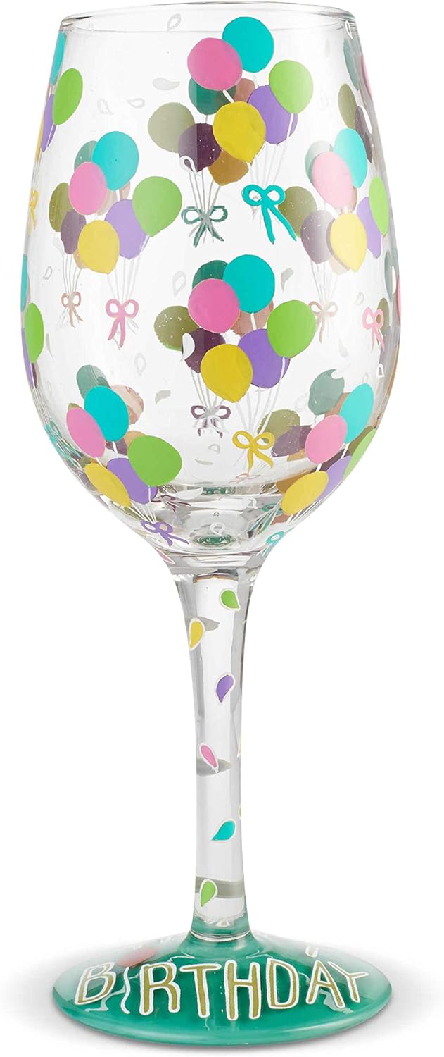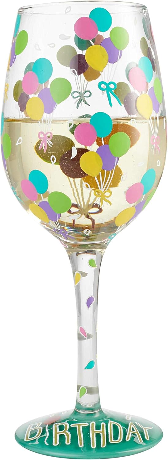 Feiern Sie Ihren Geburtstag mit diesem farbenfrohen und festlichen Lolita Weinglas. Dieses handbemalte Glas ist mit bunten Luftballons verziert und perfekt geeignet, um den besonderen Tag stilvoll zu begehen.