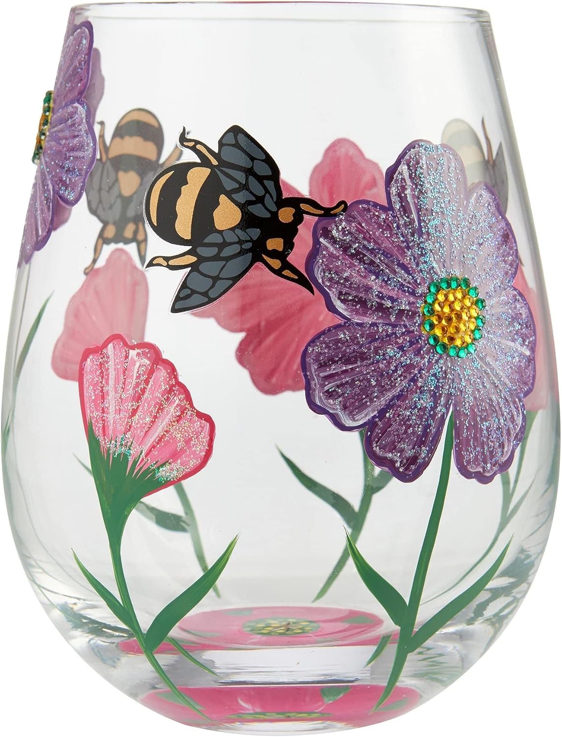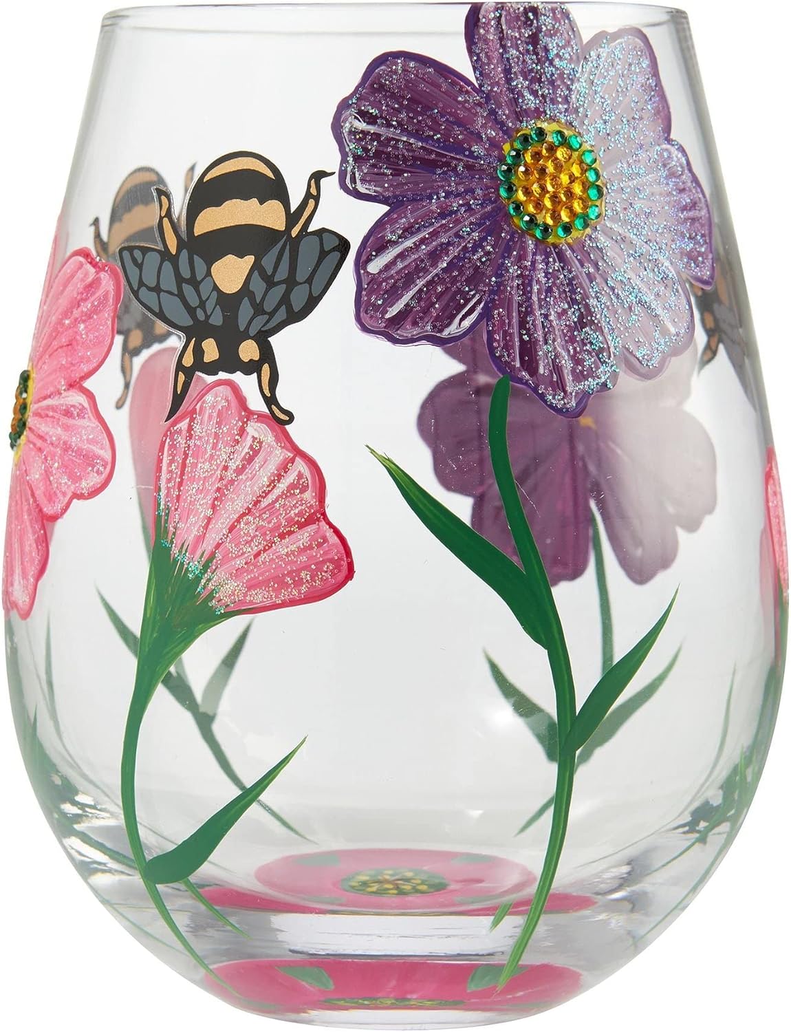Genießen Sie Ihre Lieblingsgetränke inmitten eines funkelnden Blumengartens! Das handbemalte Trinkglas "My Drinking Garden" von Lolita bezaubert mit rosa und lila glitzernden Blumen sowie goldenen Bienen, die um die Blüten tanzen.