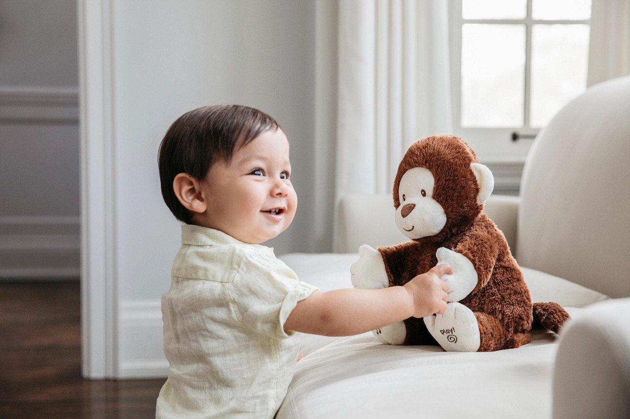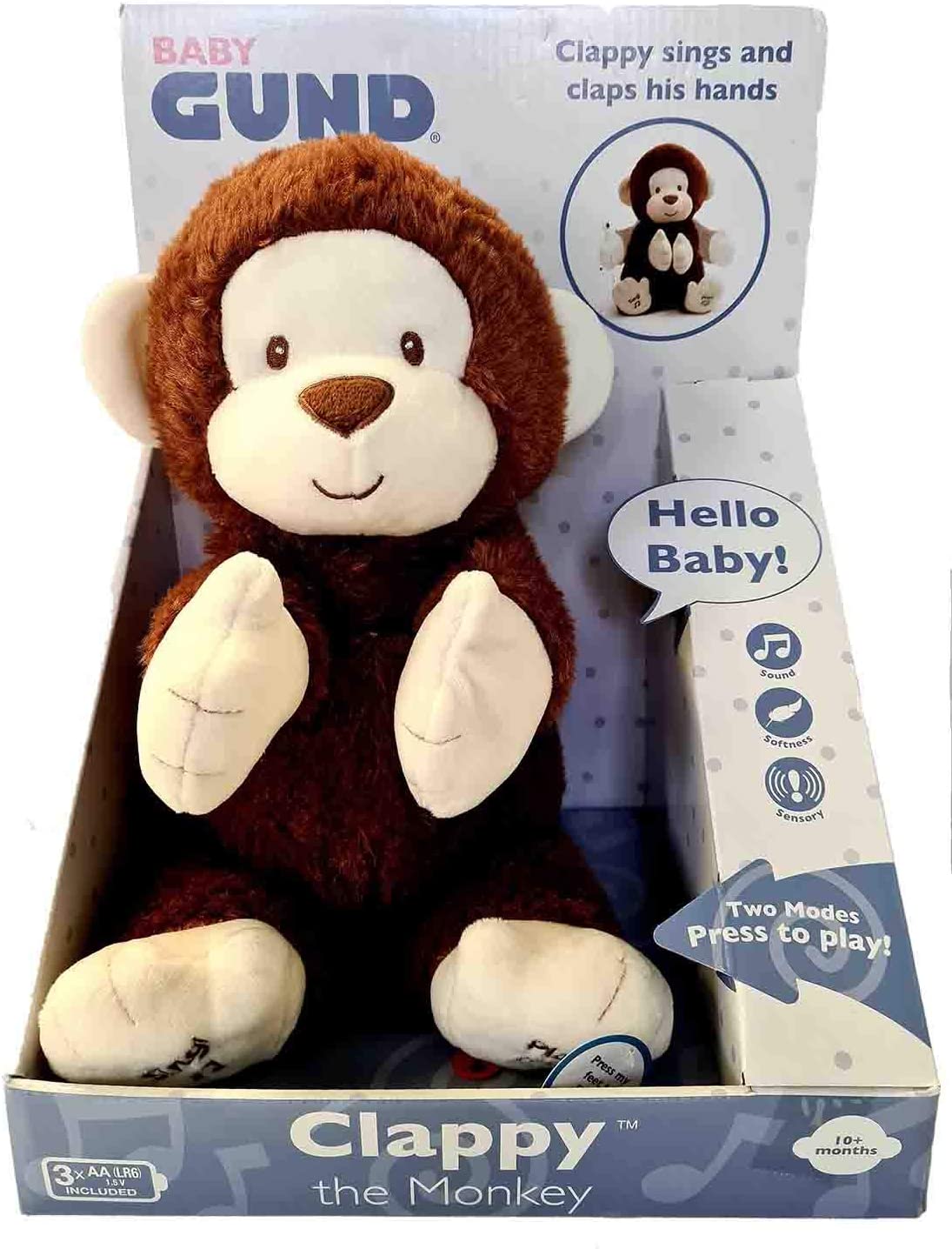 Höhe: 36 cm x 30 cm x 20 cm - Material: Stoff / Clappy ist ein begeisterter Affe mit zwei verschiedenen Spielmodi. Drücke den linken Fuß, um ein interaktives Klatschspiel zu spielen, und den rechten, um das Lied "If You're Happy and You Know It" in einer süßen Kinderstimme zu hören. Die Arme bewegen sich und klatschen während des Spiels. Clappy ist abwaschbar und für alle Altersgruppen ab 10 Jahren geeignet. Clappy benötigt drei "AA"-Batterien. Hergestellt aus weichem, anschmiegsamem Material, das den berühmten GUND-Qualitätsstandards entspricht.
