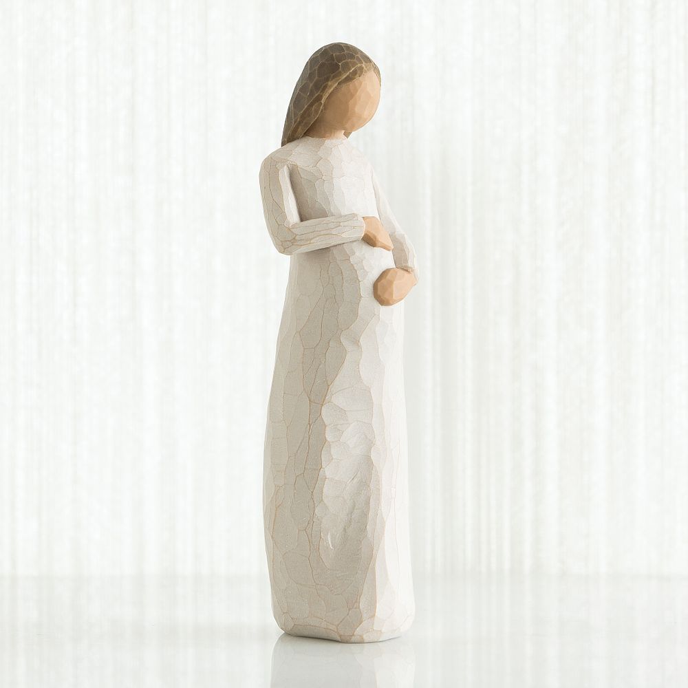 Die Cherish Figur von Willow Tree, entworfen von Susan Lordi, fängt die besondere Zeit der Schwangerschaft ein und feiert die Vorfreude auf das kommende Wunder. Diese Figur zeigt eine sehr schwangere Frau, die in einer nachdenklichen und ruhigen Haltung steht, die ihre Verbundenheit mit dem Leben und das bevorstehende Geschenk des Mutterseins symbolisiert.