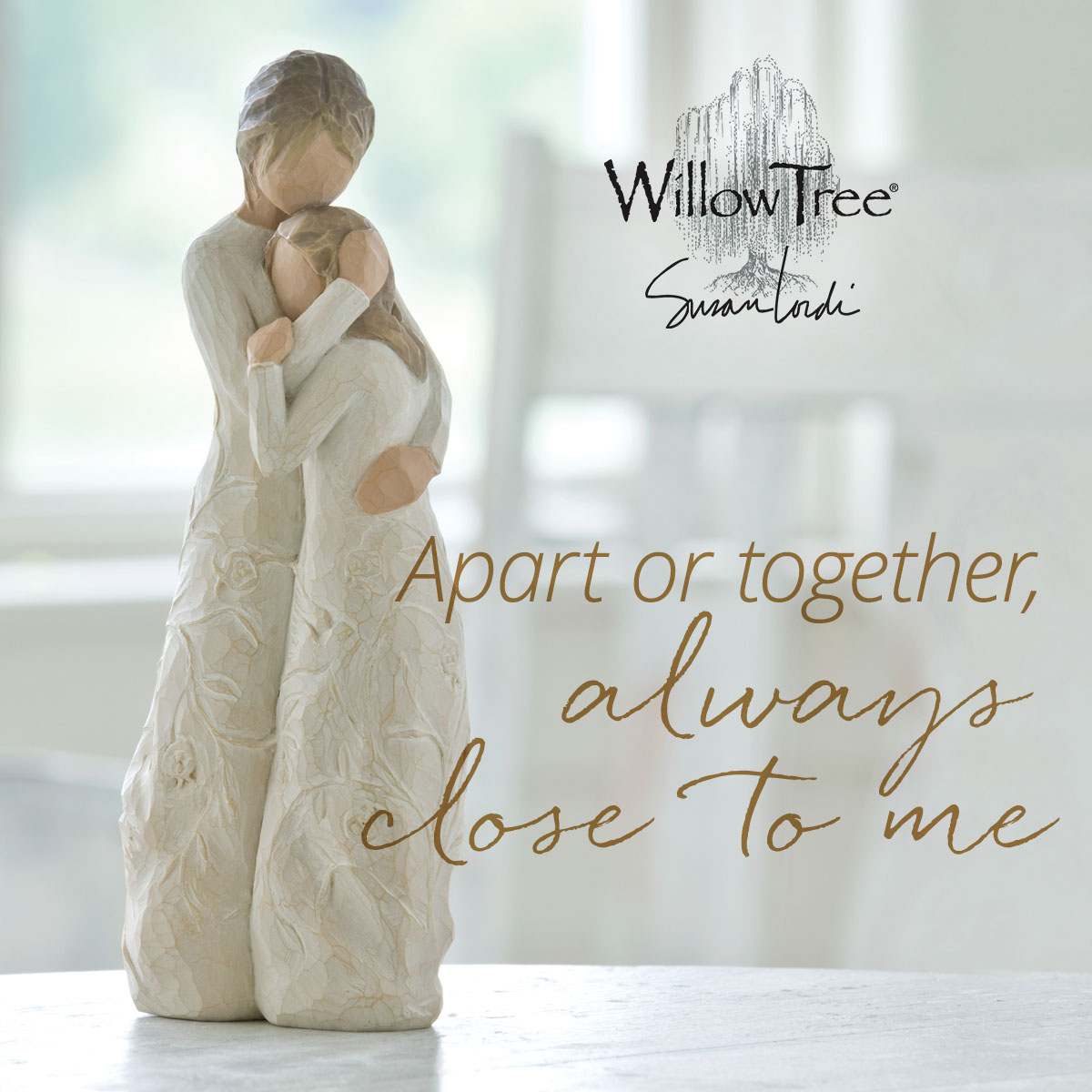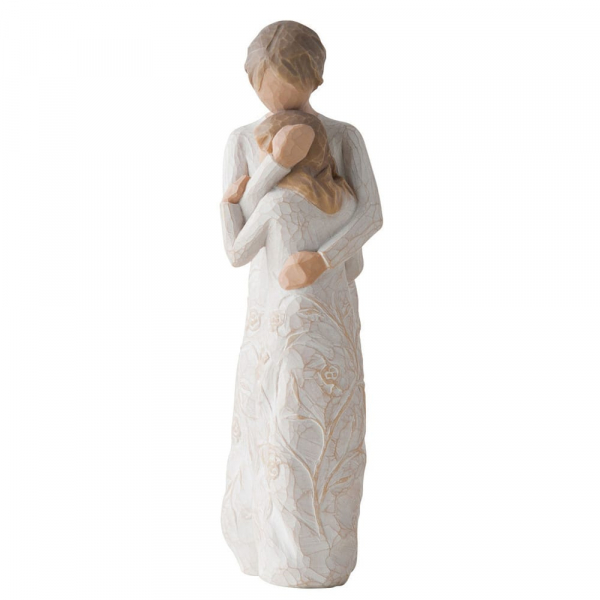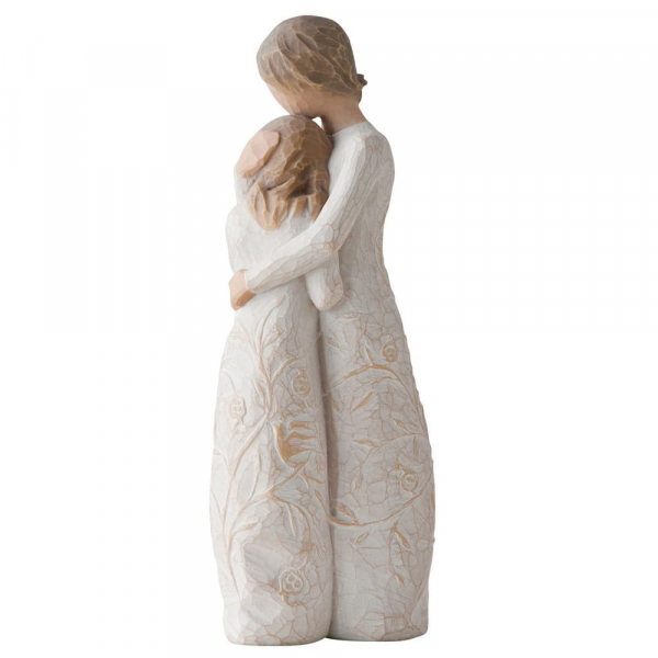 Die Close to Me Figur von Willow Tree, entworfen von Susan Lordi, fängt die emotionale Verbindung zwischen Mutter und Tochter ein, die über alle Phasen des Lebens hinweg bestehen bleibt. Egal, ob es sich um den Moment handelt, wenn ein Kind zum ersten Mal in ein Sommerlager geht oder eine Tochter zum College zieht – die Botschaft dieser Figur bleibt immer dieselbe: Unabhängig von der Entfernung, die zwischen ihnen liegt, sind Mutter und Tochter immer miteinander verbunden. „Das sentimentale Thema dieser Figur lässt sich auf jedes Alter anwenden... ein Kind, das ins Sommerlager geht, ein Teenager, der für das College wegzieht... Die Botschaft ist immer dieselbe. Die ineinander verwobenen Bilder auf den Kleidern der Figuren spiegeln visuell dieses Gefühl wider. Ich verstehe dieses Stück von beiden Seiten – als Tochter und als Mutter, die eine Tochter bis zum Erwachsenwerden begleitet hat. Ich hoffe, sowohl Mütter als auch Töchter werden die Emotionen dieser Figur nachempfinden.“ – Susan Lordi