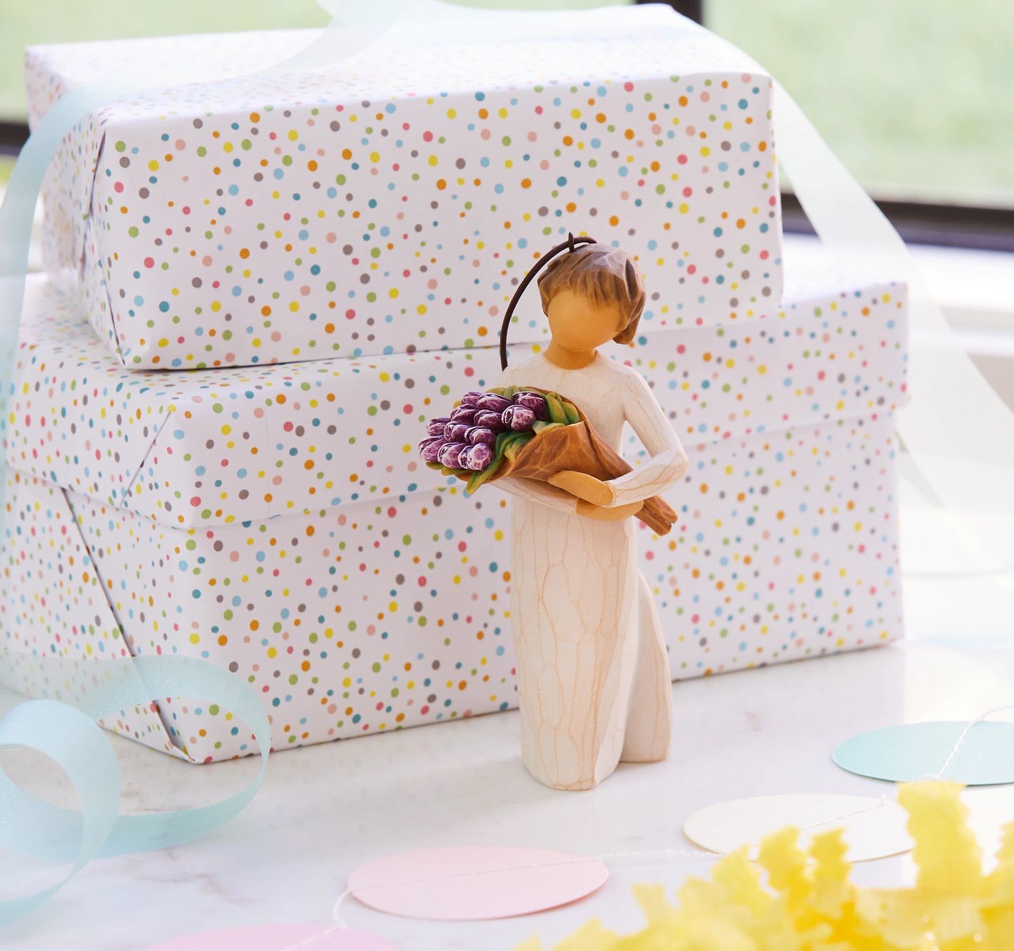 Die „Blumenmädchen Surprise“ Figur von Willow Tree, entworfen von Susan Lordi, fängt die fröhliche Überraschung ein, die ein Tulpenstrauß mit sich bringt – ein Symbol für Frühling, neue Anfänge und die Erneuerung des Lebens. Wie die Tulpen, die im Frühling aus der Erde sprießen, bringt diese Figur Hoffnung und frische Veränderungen.