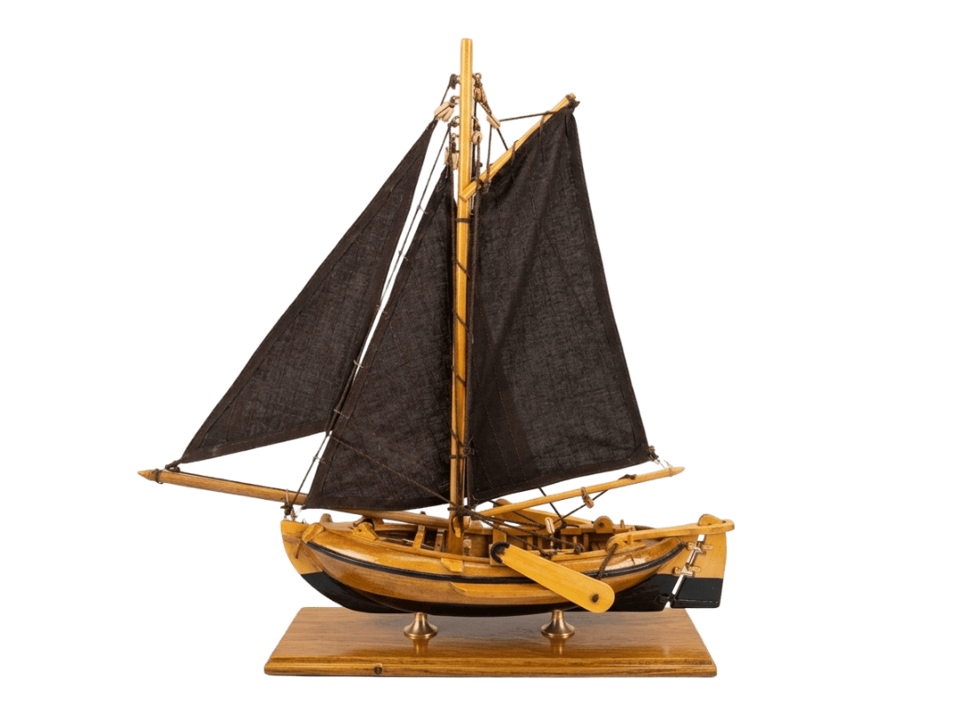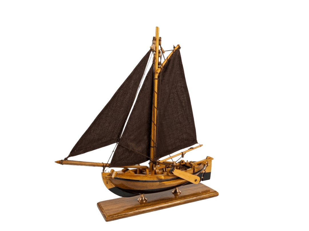 - Handgefertigt: Holzrumpf, Segelstoff, Messingdetails