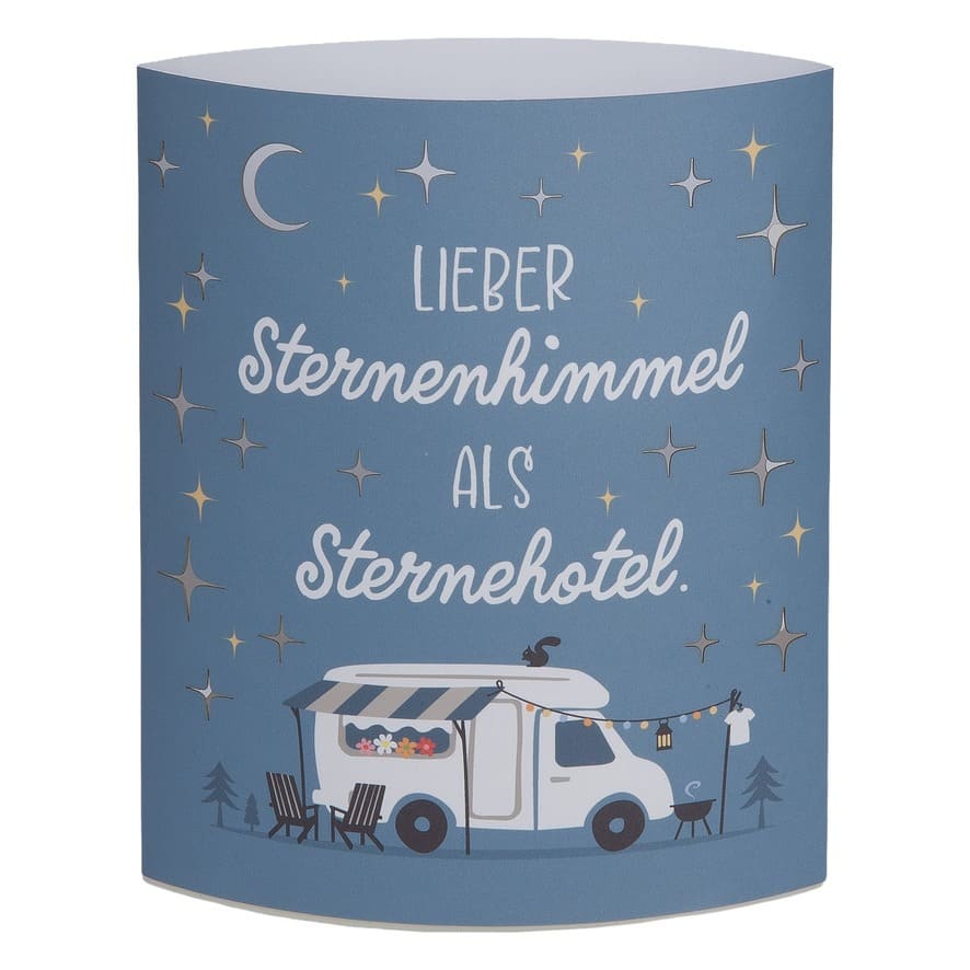 Die LED Dekoleuchte „Lieber Sternenhimmel als Sternehotel“ in Blau zaubert mit ihrem zauberhaften Design eine stimmungsvolle Atmosphäre in jeden Raum. Der inspirierende Spruch „Lieber Sternenhimmel als Sternehotel“ wird begleitet von einem Camper-Motiv sowie kleinen, kunstvoll aufgestanzten Sternen und einem Mond, durch die das Licht sanft und romantisch hindurchscheint. Perfekt für alle, die den nächtlichen Sternenhimmel lieben und das Gefühl von Freiheit genießen möchten. Die ellipsenförmige Lampe wird mit energieeffizienten LEDs betrieben, die nicht austauschbar sind, aber eine beeindruckende Lebensdauer von etwa 50.000 Stunden bieten. Sie benötigt 2 AA-Batterien (nicht im Lieferumfang enthalten) und ist mit einer praktischen Timerfunktion ausgestattet, die für zusätzliche Bequemlichkeit sorgt. Mit 3 Volt ist sie energieeffizient und sicher, was sie zu einer großartigen Beleuchtungslösung für das Wohnzimmer, den Campingplatz oder als Geschenk für Natur- und Campingfreunde macht. Ideal als stimmungsvolle Beleuchtung für den Garten, das Wohnzimmer oder den Campingplatz – die Camperglück LED Dekoleuchte ist das perfekte Accessoire für alle, die das Camperleben lieben und die Atmosphäre eines gemütlichen Campingabends ins Zuhause holen möchten.