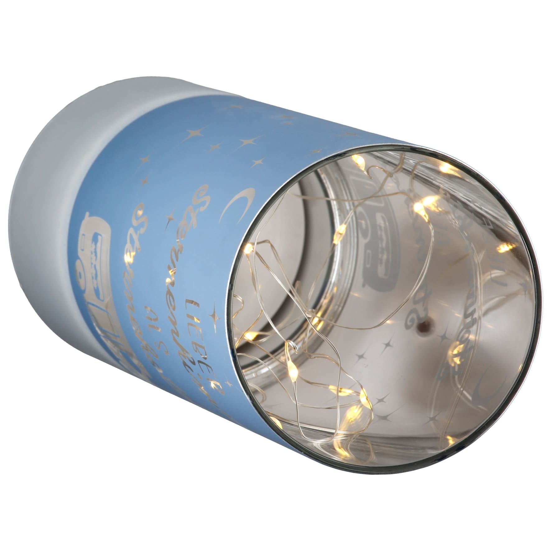 Das Gilde Windlicht „Camperglück“ in Blau mit grauem Fuß ist die perfekte stimmungsvolle Beleuchtung für Camper und Naturfreunde. Das zylindrische Windlicht aus Glas lässt das Licht durch den Camper, den Spruch „Lieber Sternenhimmel als Sternehotel“ sowie Sterne und einen Mond hindurchscheinen – ideal für eine entspannte Atmosphäre, die an den freien Himmel und den Campingurlaub erinnert. Im Inneren befindet sich eine Lichterkette, die für eine sanfte und gemütliche Beleuchtung sorgt. Dieses Windlicht wird mit 3 x AAA-Batterien betrieben (nicht im Lieferumfang enthalten) und verfügt über eine praktische Timerfunktion, die das Licht automatisch ein- und ausschaltet. Mit einer Höhe von 15 cm und einem Durchmesser von 7 cm eignet es sich hervorragend für den Innenbereich, die Terrasse oder den Campingplatz.