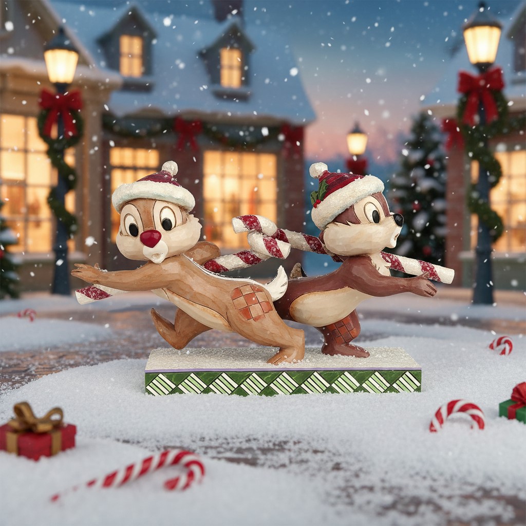 Die berühmten streitbaren Streifenhörnchen Chip & Dale, oder wie sie liebevoll auch genannt werden, Chip & Chap, zeigen sich in dieser bezaubernden Disney Traditions Figur von Jim Shore in einem besonders niedlichen Moment. Mit ihren Zuckerstangen ineinander verhakt, geraten die beiden in typisch chaotischer Manier durcheinander. Während sie aneinander vorbeilaufen, scheinen sie wohl unterschiedliche Dinge im Sinn zu haben – ein amüsantes Schauspiel, das die charakteristische Eigenart der beiden perfekt widerspiegelt.