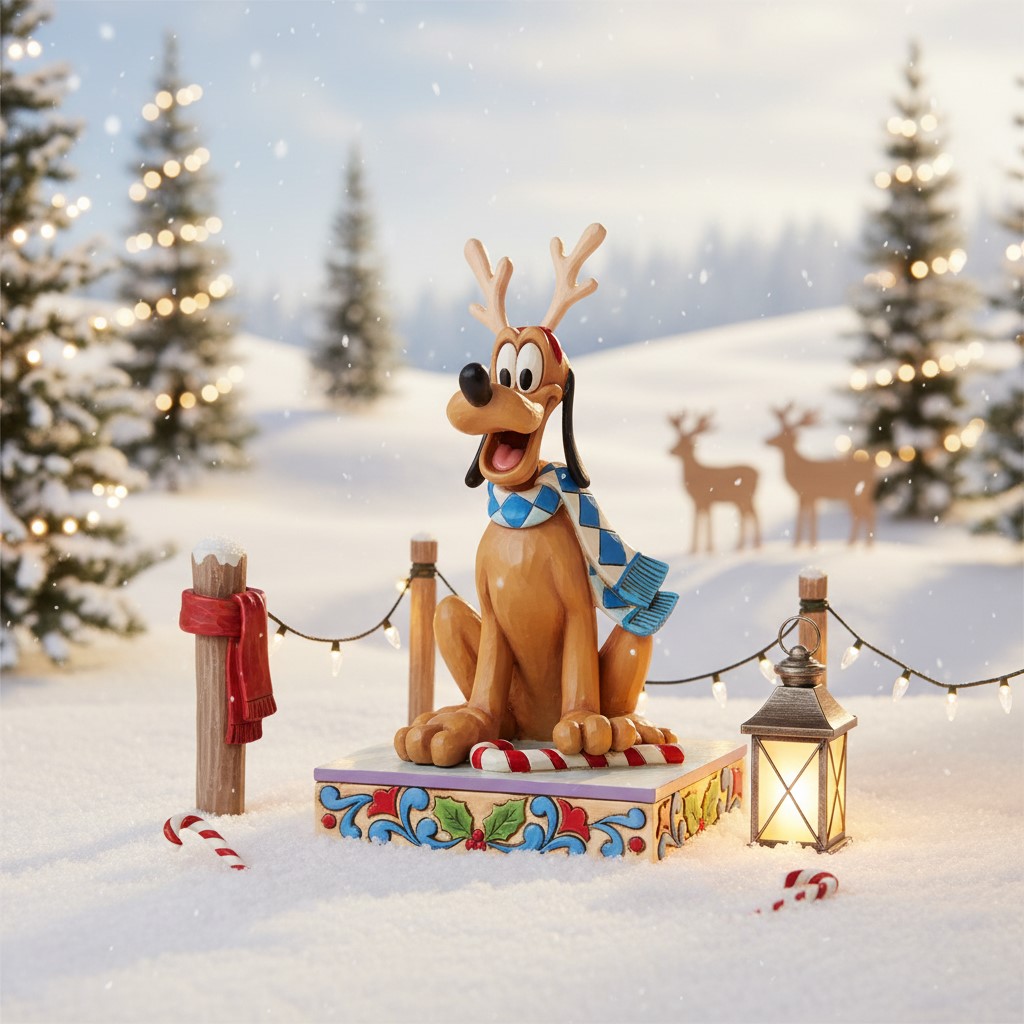 Pluto ist in festlicher Stimmung und bereit für das Weihnachtsfest! Mit einem fröhlichen Lächeln trägt der liebenswerte Hund seinen charmanten Schal im blau-weißen Patchwork-Muster, der ihm einen Hauch von Winterwärme verleiht. Auf seinem Kopf sitzt ein Paar lustige Rentiergeweihe, die ihn perfekt auf die festliche Saison einstimmen. In der einen Pfote hält Pluto eine zuckersüße Zuckerstange – ein weiterer Hinweis auf die Vorfreude auf das Weihnachtsfest. Diese detailreiche Figur von Jim Shore fängt die verspielte, treue Natur von Pluto ein und strahlt eine wunderbare Weihnachtsstimmung aus.