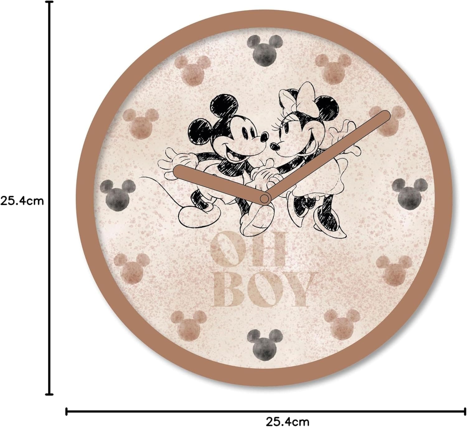 Bringe ein Stück Disney-Magie in dein Zuhause mit dieser charmanten Wanduhr im Retro-Look. Die Disney Wanduhr zeigt die beliebten Micky Maus und Minnie Maus, die händchenhaltend in der Mitte der Uhr laufen. Die Uhr hat einen Durchmesser von 25,4 cm und ist nicht nur funktional, sondern auch ein echter Hingucker für jedes Zimmer. Anstelle der üblichen Ziffern hat die Uhr kleine, ikonische Micky Maus Köpfe in Schwarz und Brauntönen, die der Uhr einen verspielten Charme verleihen. Die Uhr sorgt dafür, dass du die Zeit ganz ohne störende Geräusche ablesen kannst – ideal für Schlafzimmer, Wohnzimmer oder Kinderzimmer.