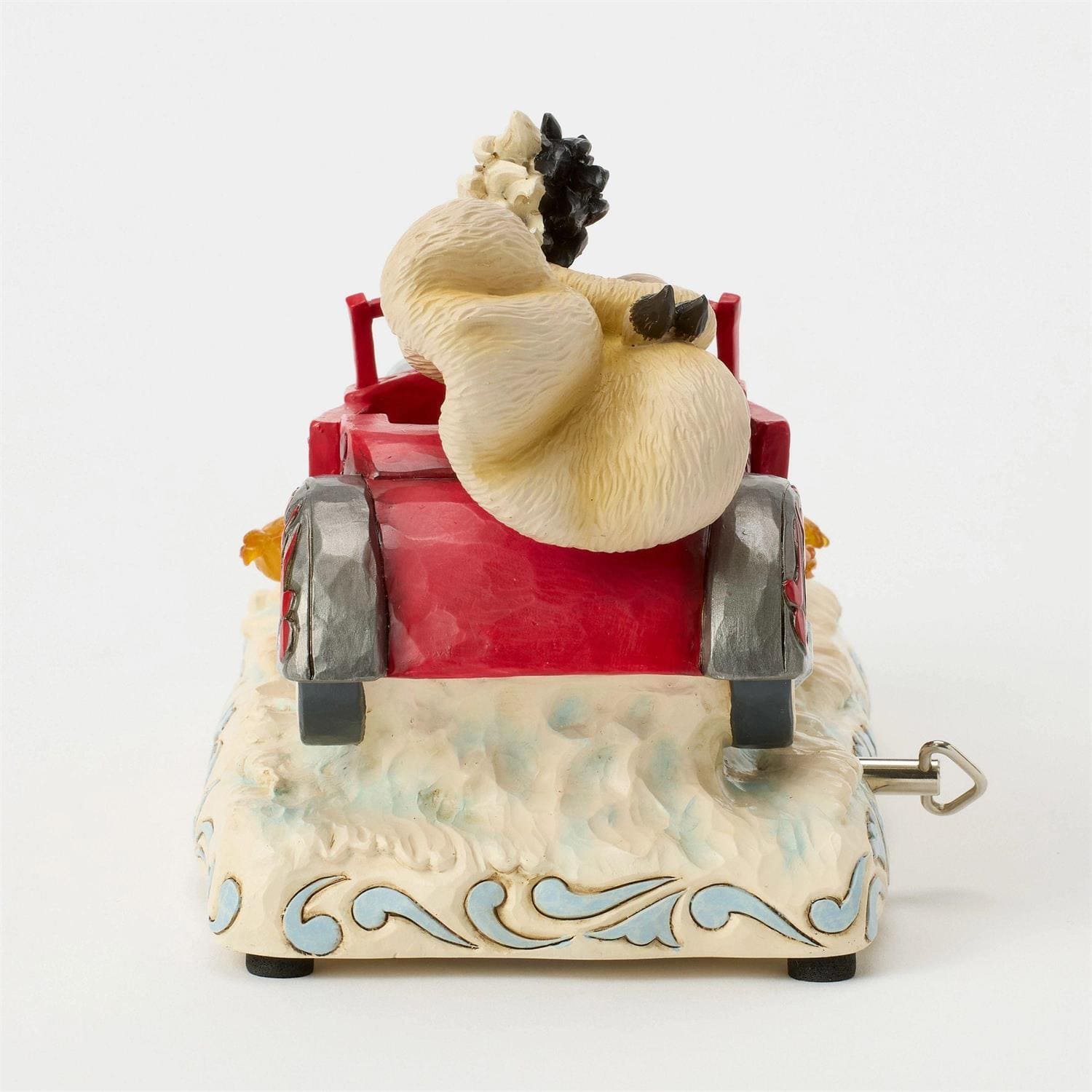 Zum 65. Jubiläum von 101 Dalmatiner zeigt diese detailreiche Jim Shore Figur die wilde Cruella de Vil in ihrem roten Auto. Mit auffälligen Rosemaling- und Patchworkmustern verziert, rasen Flammen aus dem Motor, während Cruellas wilde Haare und ihr Pelzmantel im Wind wehen – eine dynamische Darstellung ihres unvergesslichen Stils. Die Musik- und Aufziehfunktion macht dieses Sammlerstück besonders lebendig.