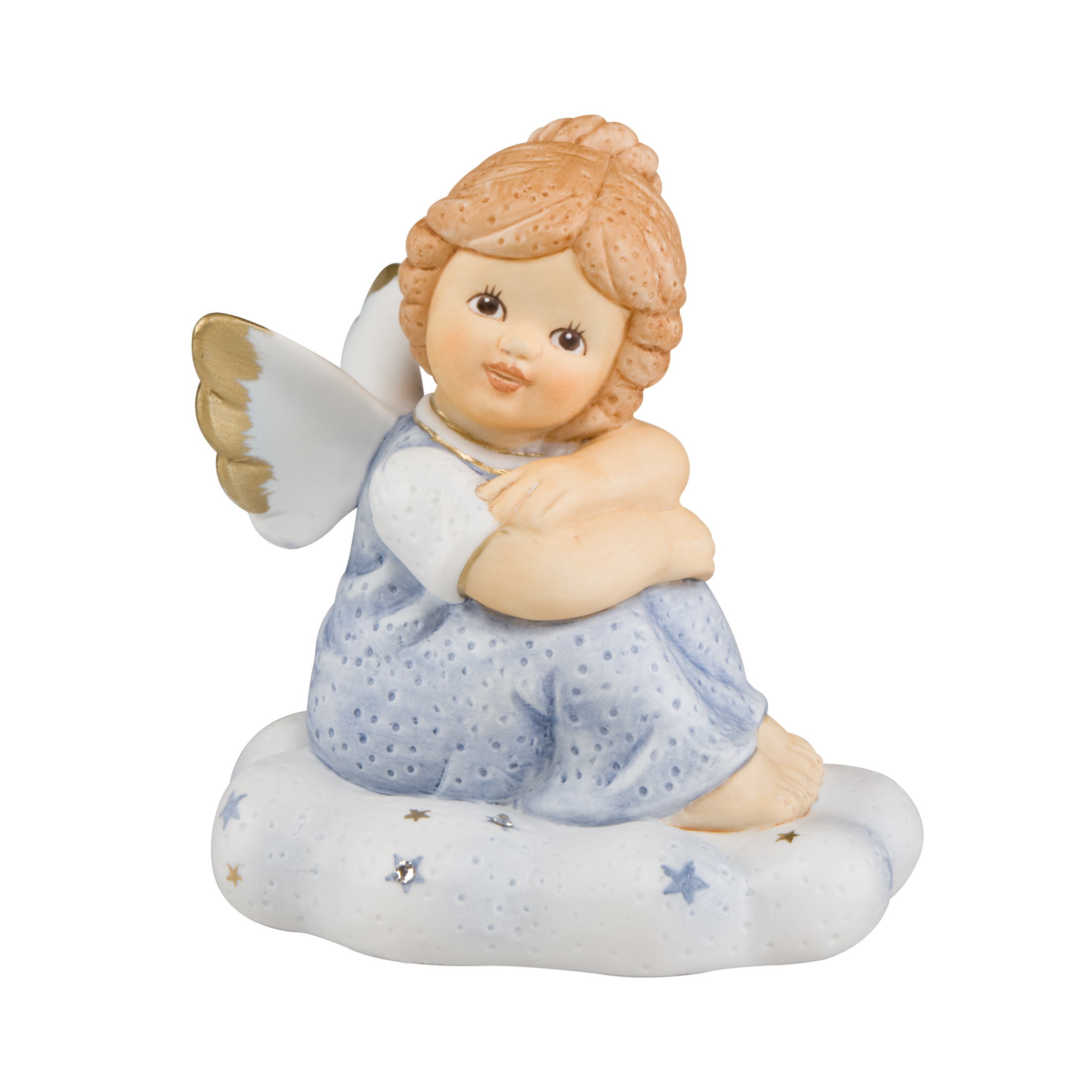 Die Goebel Figur „Ich denke an dich“ aus der Nina & Marco Engel Kollektion zeigt einen Engel, der auf einer Wolke sitzt, mit verschränkten Armen und nachdenklich geneigtem Kopf. Die Figur, die in sanften Hellblau- und Weißtönen gehalten ist, strahlt Ruhe und Besinnlichkeit aus. Veredelt mit Swarovski Kristallen, erhält der Engel einen besonderen Glanz und verleiht der Figur einen Hauch von Eleganz. Mit einer Höhe von 10 cm vermittelt diese Figur auf besonders feine Weise eine Nachricht der Zuneigung und des Nachdenkens.