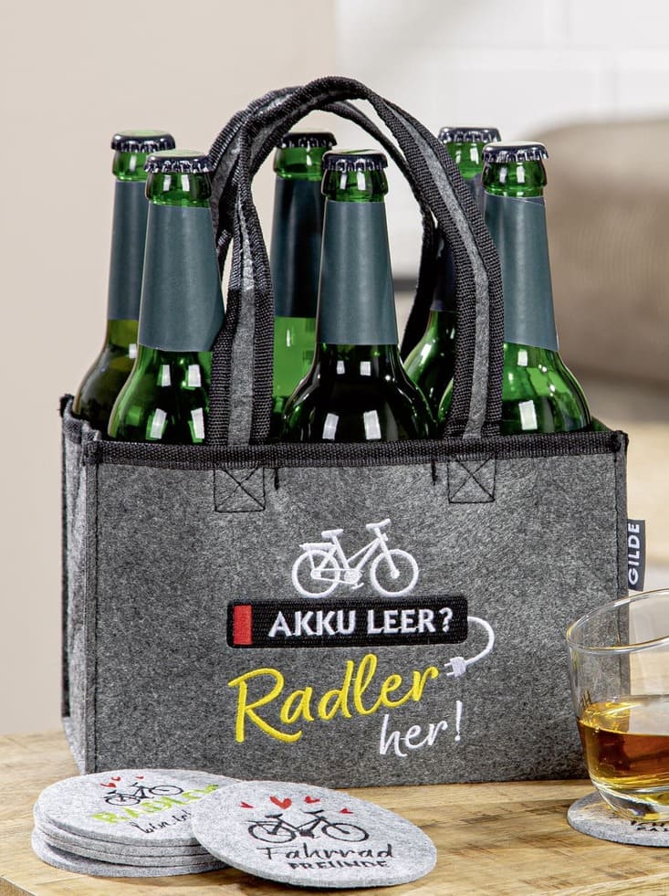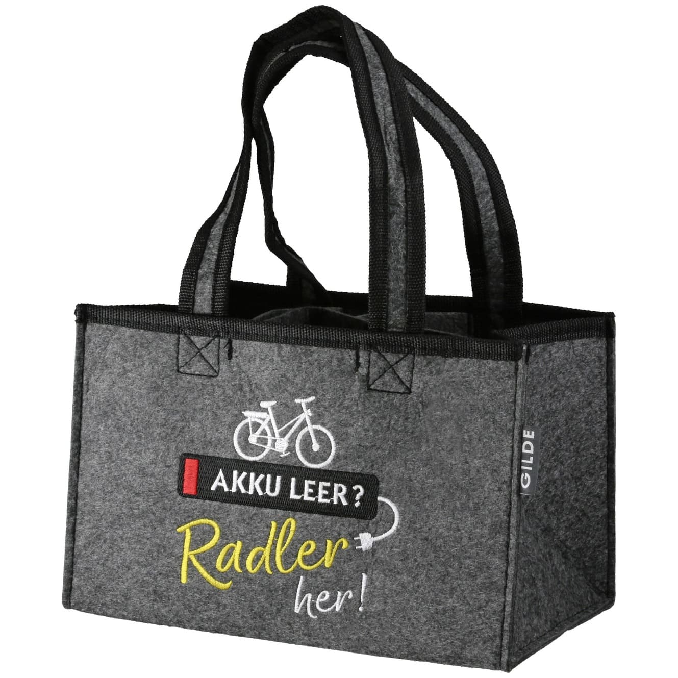 Flaschentasche Akku leer, Radler her - Gilde Flaschentasche Filztasche 44074 / Flaschenträger 6 Flaschen - Tragetasche