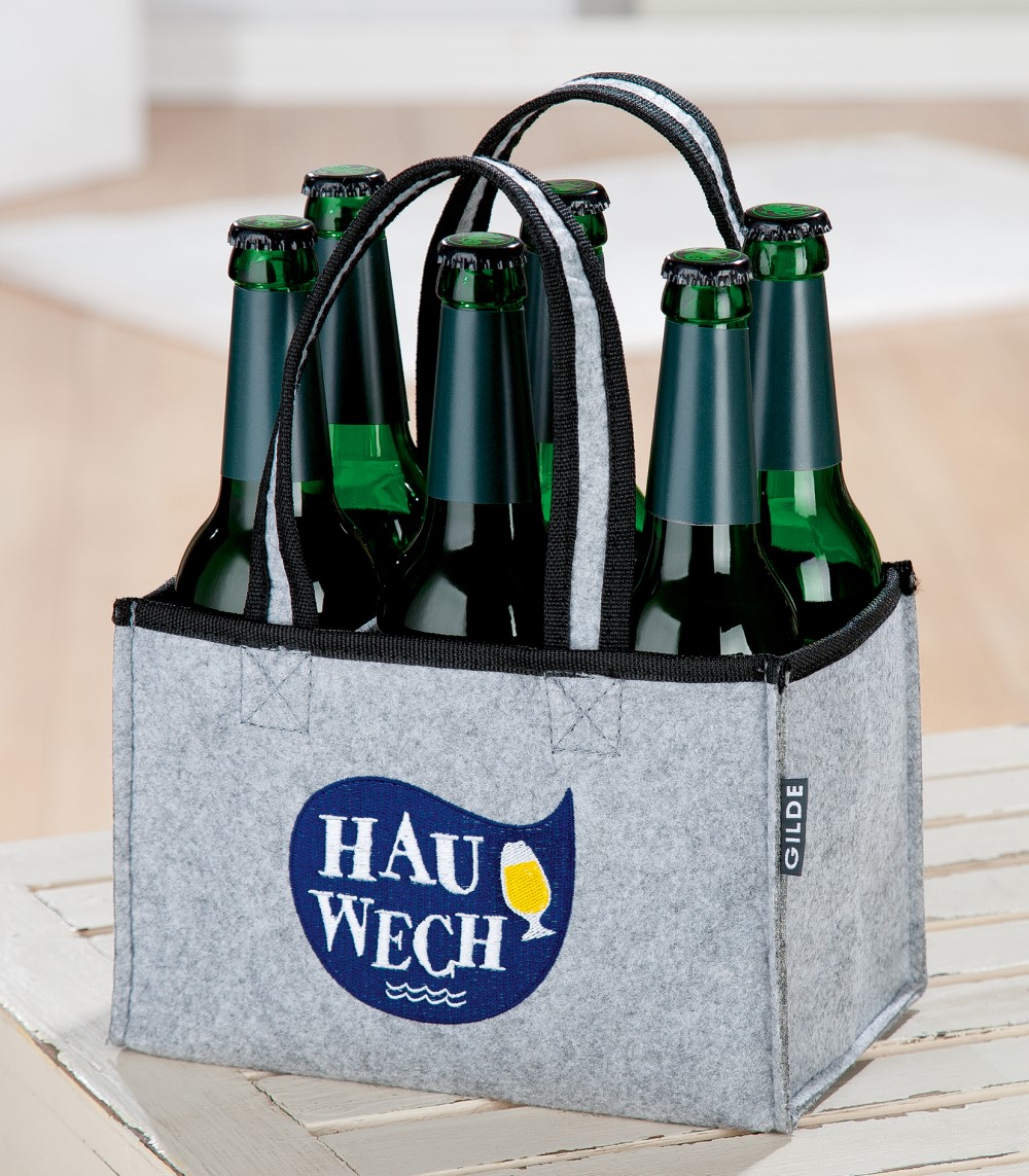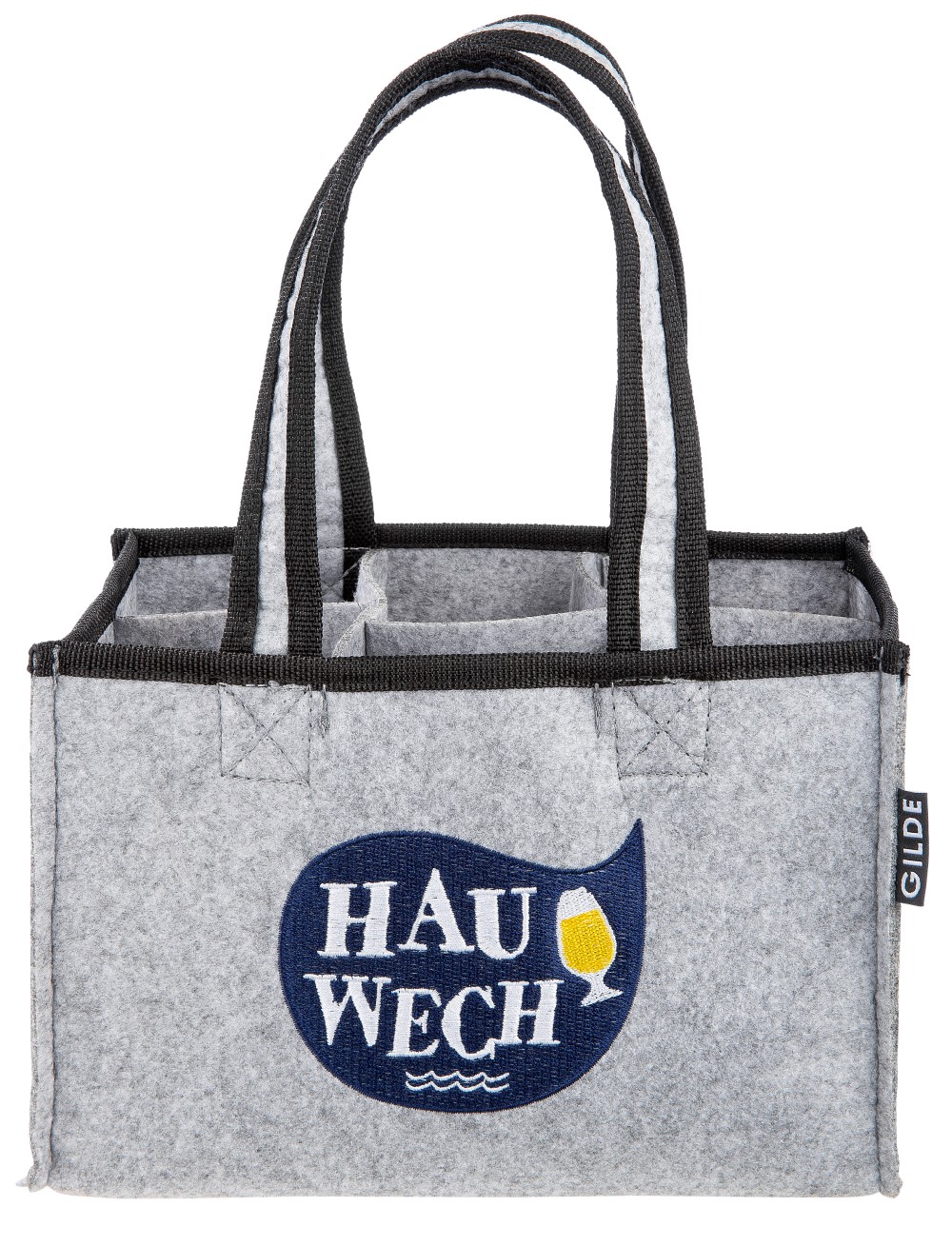 Gilde Flaschentasche „Hau wech“ – witzig, praktisch und ein echter Blickfang - Modern, praktisch und humorvoll: Die hellgraue Flaschentasche „Hau wech“ mit aufgesticktem Bierglas und dem lustigen Schriftzug „Hau wech“ ist der perfekte Begleiter für alle, die es locker mögen. Sie bietet Platz für 6 Flaschen à 0,33L und ist ideal für Grillpartys, feuchtfröhliche Abende oder als originelles Geschenk für Bierliebhaber.