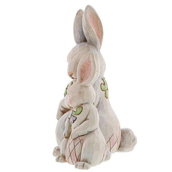 • Folkloristisches Design – Die Hasen tragen traditionelle, handbemalte Muster, die den rustikalen Charme von Jim Shore betonen