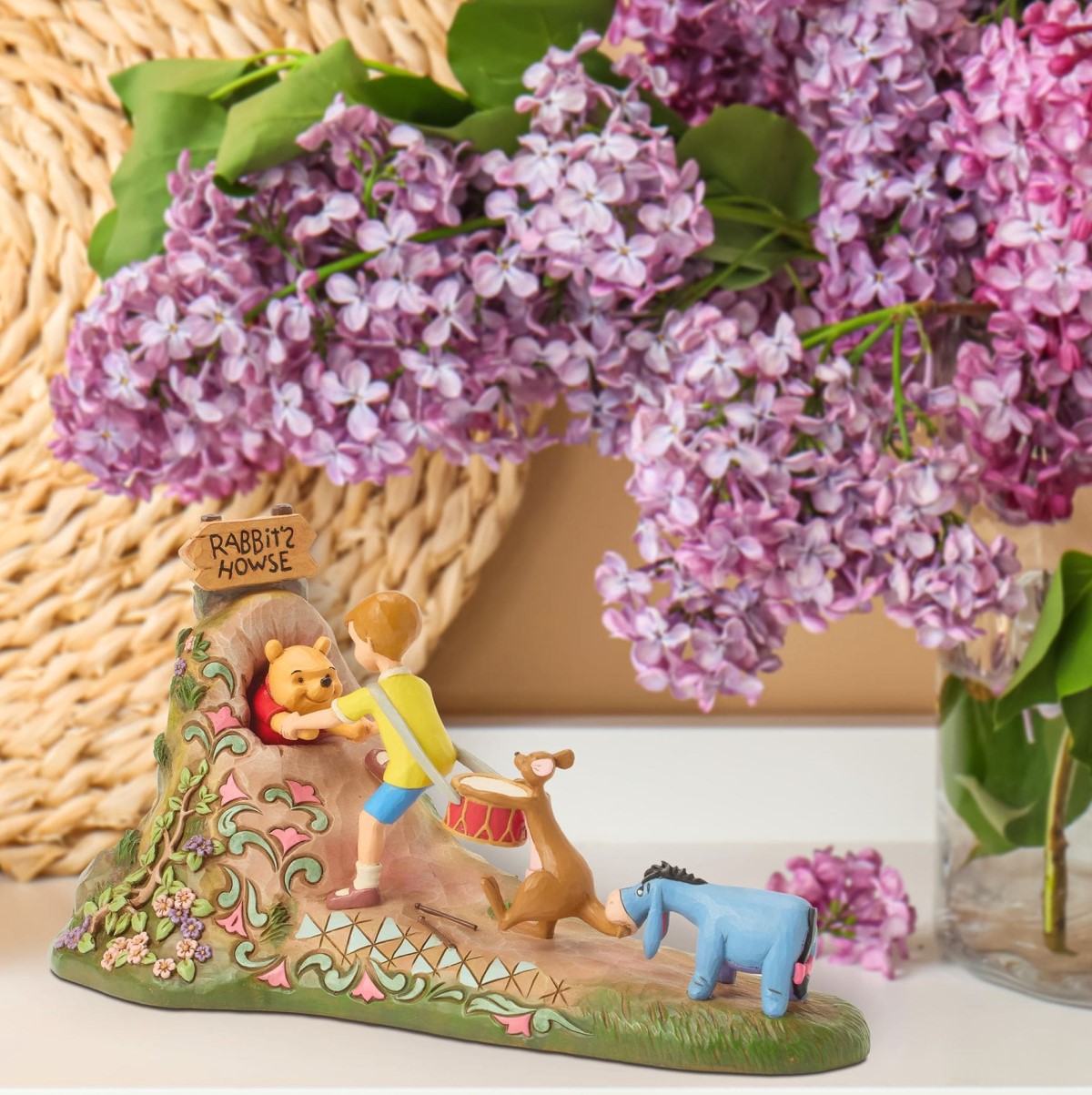 Nach einer Feier im Hundertmorgenwald braucht Winnie Puuh ein wenig Hilfe, um aus Rabbits Haus herauszukommen. Christopher Robin, Kanga und I-Aah ziehen an seinen Händen, während Rabbit von hinten schiebt. Diese liebevoll gestaltete Szene ist mit Jim Shores typischen Rosemaling- und Quiltmustern sowie sanften floralen Akzenten verziert und strahlt Nostalgie und Wärme aus.