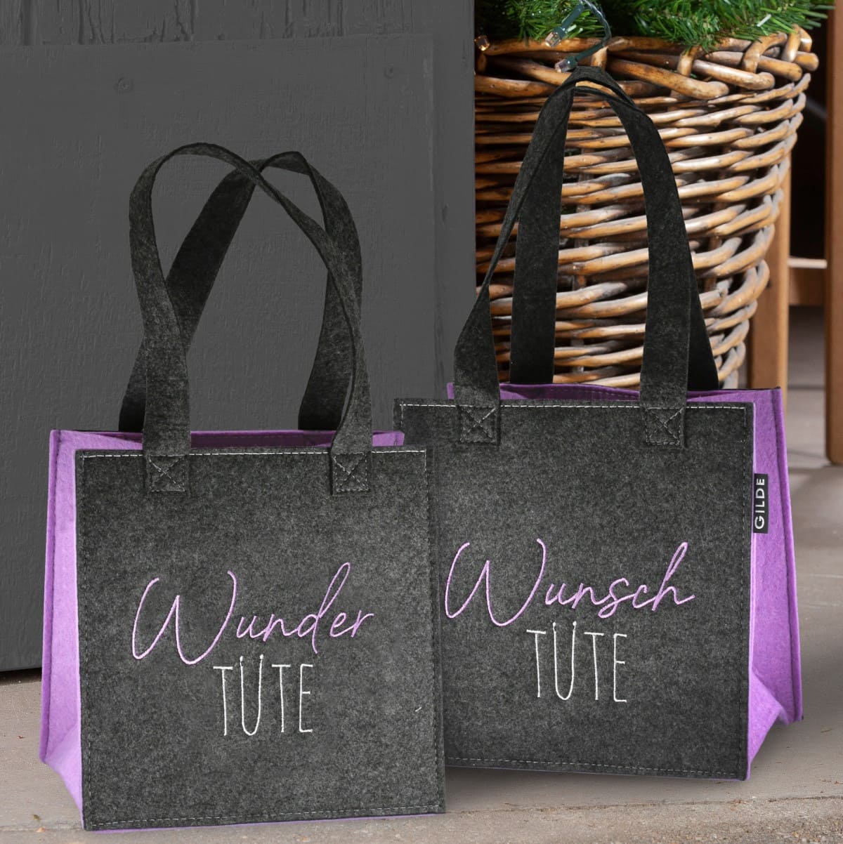 Die Geschenktasche „Wundertüte“ in dunkelgrau ist ein stilvoller Begleiter für besondere Geschenke. Der fröhliche Schriftzug „Wundertüte“ in lila sorgt für eine moderne und verspielte Note, während der lila Filz an den Seiten der Tasche für einen harmonischen Farbkontrast sorgt. Mit einer Belastbarkeit von bis zu 6 kg ist sie robust genug, um Flaschen, Bücher oder andere Überraschungen sicher zu transportieren. Diese Tasche ist nicht doppellagig, bietet aber durch die hochwertige Verarbeitung dennoch eine hohe Stabilität und Langlebigkeit. Ob als Geschenkverpackung für einen besonderen Anlass oder als kreative Idee für kleine Überraschungen – die „Wundertüte“ wird garantiert ein Lächeln auf das Gesicht des Beschenkten zaubern.