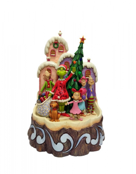 Die Carved by Hearts Figuren sind exklusiv von Jim Shore gefertigt und bringen festliche Magie in Ihr Zuhause. Diese Szene zeigt den Grinch, Max, Cindy Lou Who und die Bewohner von Whoville, die sich vor einer beleuchteten Häuserkulisse versammeln. Mit Batterien (nicht im Lieferumfang enthalten) erstrahlt die Figur in festlichem Licht und bringt die Weihnachtsgeschichte zum Leben.