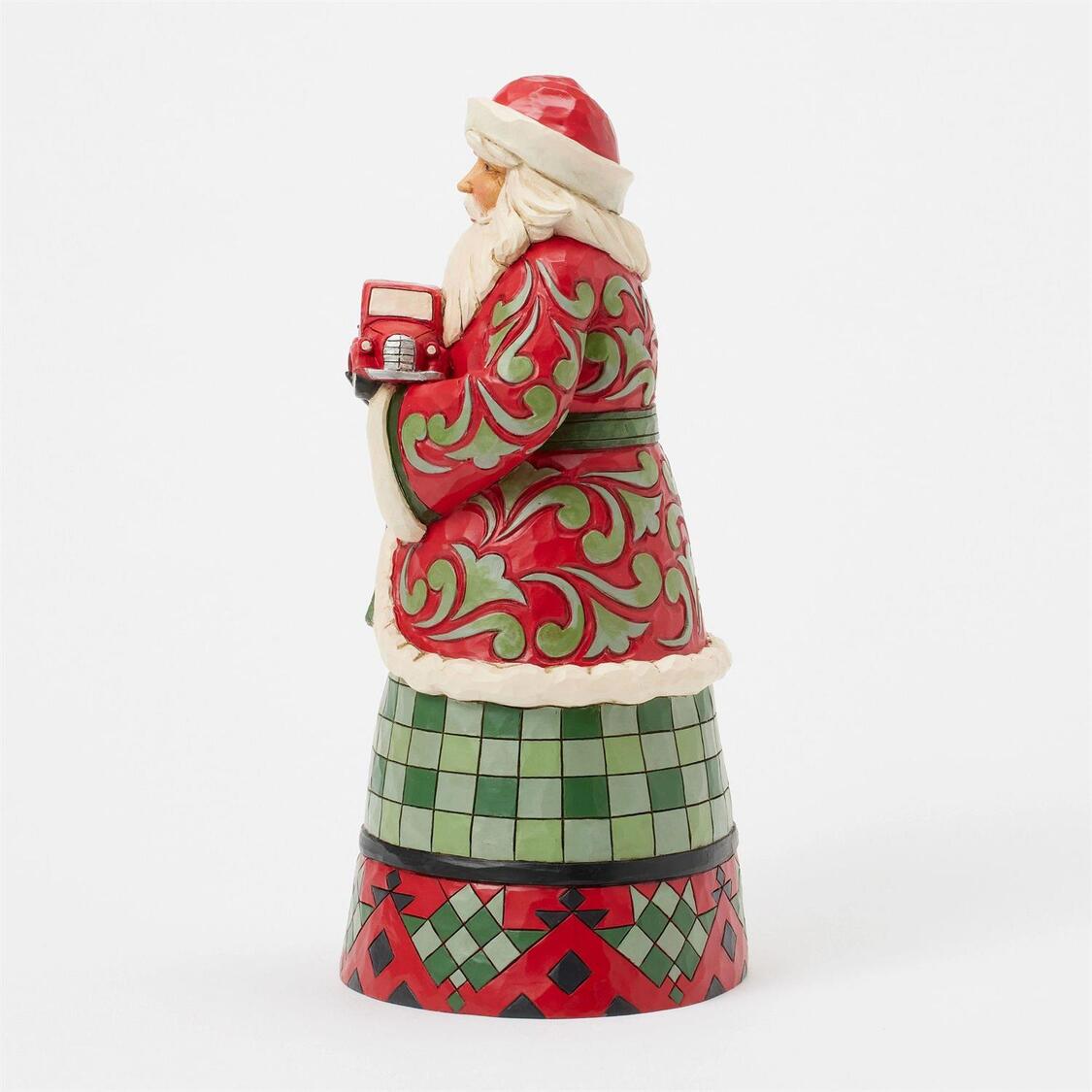 Dieses charmante Jim Shore Design zeigt den Weihnachtsmann, der einen roten Truck hält und dabei einen gemütlichen, festlichen Buffalo-Check-Mantel trägt, der die Wärme der Feiertage verkörpert.