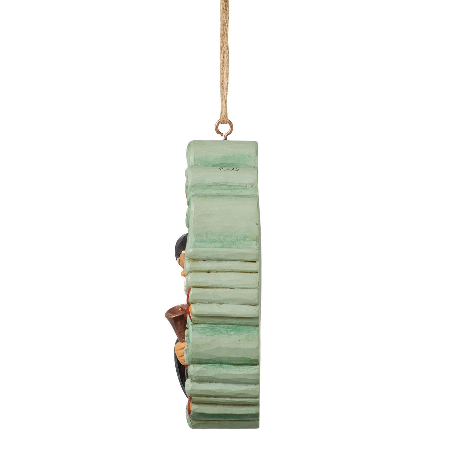 - Blumenschmuck in Rot und Grün: Das Ornament ist kunstvoll eingerahmt von rotem und grünem Blumenschmuck, der typisch für die weihnachtlichen Motive von Jim Shore ist. Die floralen Akzente fügen sich perfekt in die festliche Atmosphäre ein.