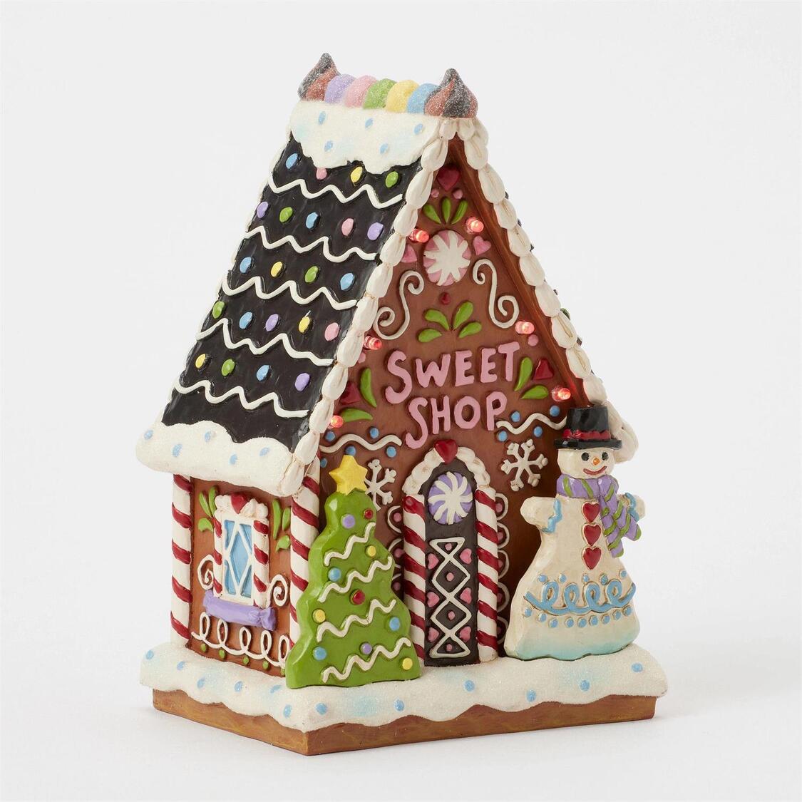 Dieses bezaubernde Jim Shore LED-Design zeigt einen süßen Laden im Stil eines Lebkuchenhauses, verziert mit buntem Zuckerguss, Keksen und Bonbons. Die Vorderseite leuchtet warm und lädt in eine Welt voller köstlicher Leckereien und festlicher Freude ein, was es zu einem bezaubernden Mittelpunkt für Ihre Dekoration macht.