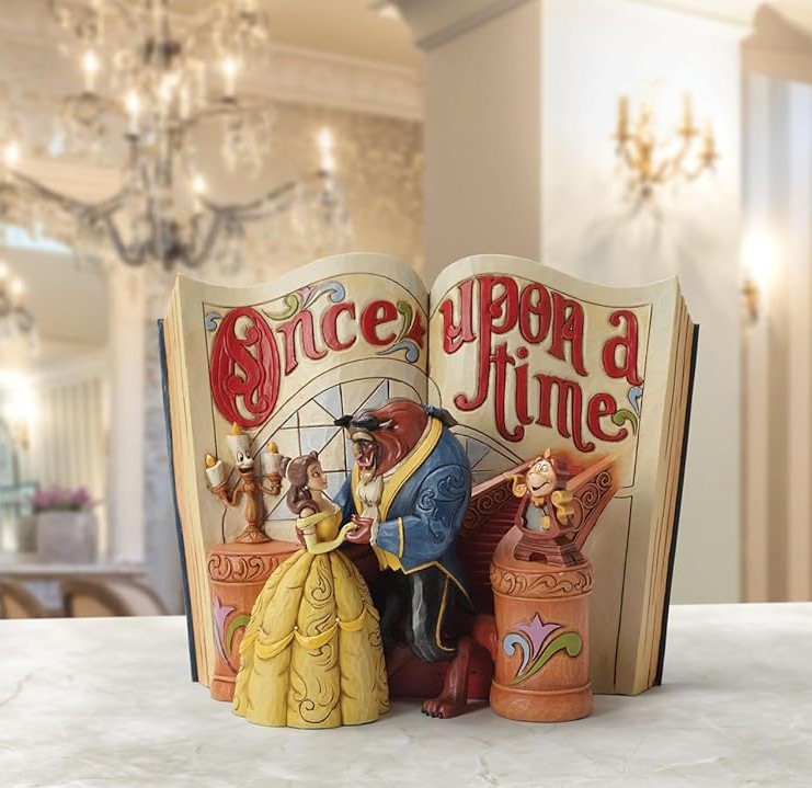 Dieses bezaubernde Storybook aus der Disney Traditions Kollektion von Jim Shore fängt einen der schönsten Momente aus Die Schöne und das Biest ein. Belle im eleganten gelben Ballkleid und das Biest im schicken blauen Frack tanzen gemeinsam auf der großen, geschwungenen Treppe, während sie sich inmitten des königlichen Saals verliebt anblicken. Im Hintergrund beobachten Cogsworth und Lumière voller Begeisterung das magische Tanzpaar. Diese liebevoll gestaltete Szene wird durch die Detailtreue und die lebendige Handbemalung von Jim Shore zum Leben erweckt.