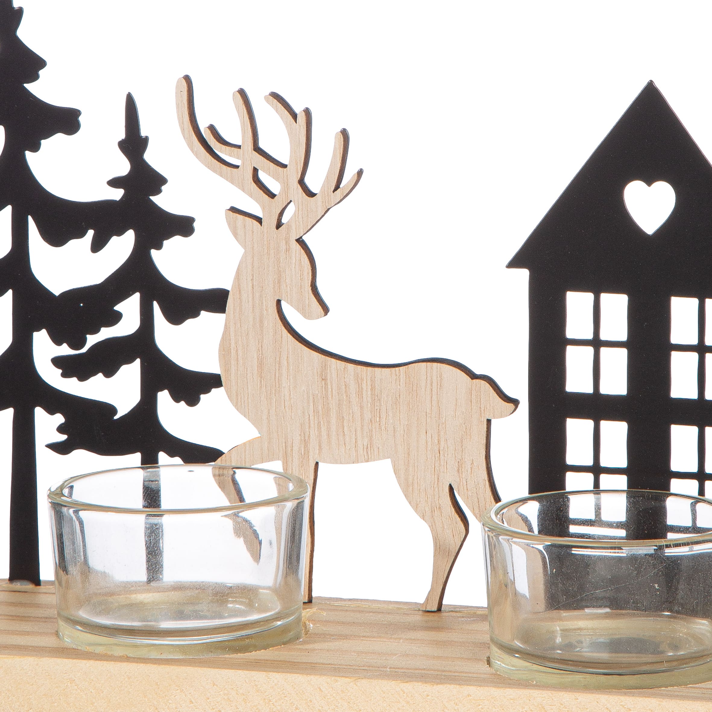 Der Teelichtleuchter „Vado“ von Gilde bringt mit seinem rustikalen Design winterliche Gemütlichkeit in Ihr Zuhause. Auf einer natürlichen Holzplatte sind zwei Teelichthalter integriert, die stimmungsvolles Kerzenlicht verbreiten. Im Hintergrund thront ein stilisierter Hirsch bzw. Elch aus Holz, der das Motiv der Winter- und Waldzeit perfekt unterstreicht. Links davon stehen zwei unterschiedlich hohe, schwarze Metalltannen, rechts ein schwarzes Haus mit einem herzförmigen Giebel und daneben eine weitere Metalltanne – alles harmonisch arrangiert für eine behagliche Atmosphäre. Dieses Dekostück eignet sich ideal als stimmungsvolle Tisch- oder Fensterbank-Deko in der kalten Jahreszeit und verleiht jedem Raum einen charmanten, naturnahen Look.