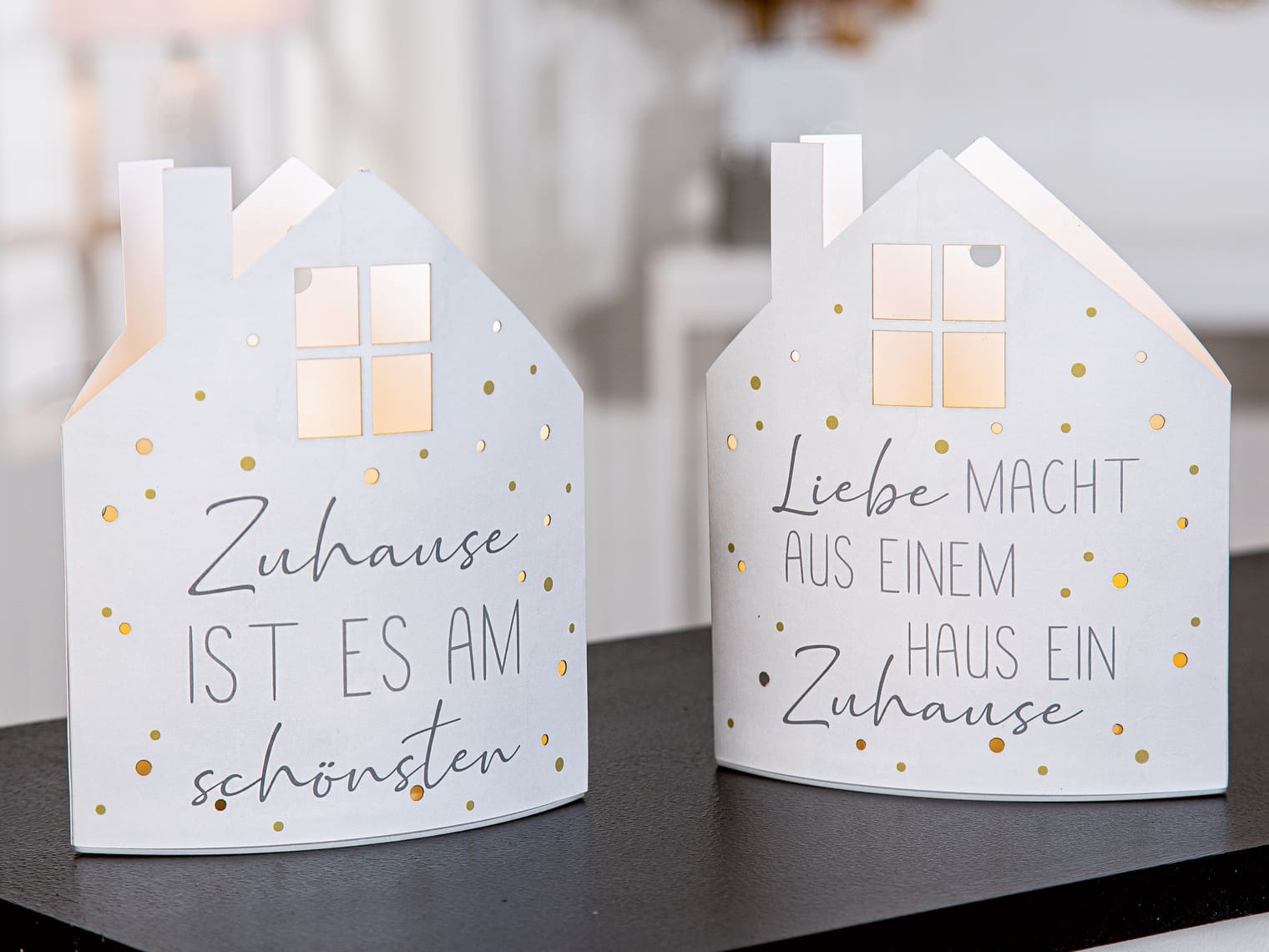 Diese liebevoll gestaltete Tischleuchte in Hausform von Gilde Handwerk bringt Wärme und Geborgenheit in jeden Raum. Die Aufschrift „Liebe macht aus einem Haus ein Zuhause“ erinnert an das, was wirklich zählt – einen Ort zum Wohlfühlen. Die Papplampe ist wie ein kleines Häuschen geformt, mit Schornstein, einem beleuchteten Dachfenster und zahlreichen feinen Lichtpunkten, die beim Einschalten ein zauberhaftes Lichtspiel erzeugen. Perfekt für Fensterbank, Sideboard oder Nachttisch – als stimmungsvolle Deko, Nachtlicht oder Geschenkidee.