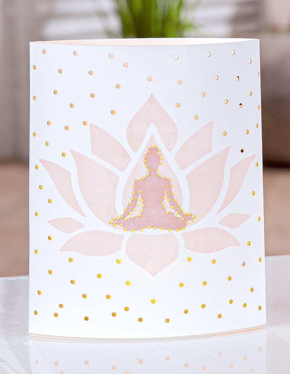 Im Mittelpunkt steht eine filigrane Lotusblüte, durch die das Licht besonders schön leuchtet. Davor sitzt eine Frau in typischer Yoga-Pose – ein Symbol für innere Balance, Achtsamkeit und Ruhe. Eine stilvolle Leuchte, die Körper, Geist und Raum in Einklang bringt.