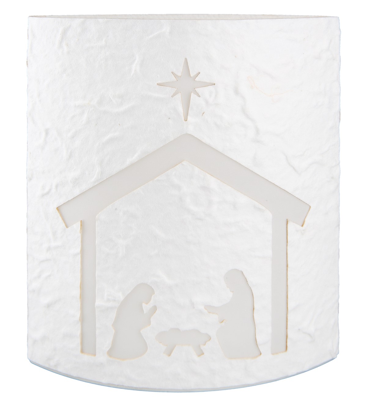Diese stimmungsvolle cremefarbene Tischleuchte von Gilde Handwerk bringt die Weihnachtsbotschaft auf ganz besondere Weise zum Leuchten. In der Mitte der ausgestanzten Szene erkennt man Maria, Josef und das Jesuskind in der Krippe – darüber wacht ein heller Stern als Zeichen der Hoffnung. Die strukturierte Oberfläche der Leuchte verleiht ihr eine besondere Tiefe, während das warmweiße LED-Licht durch die feinen Ausschnitte scheint und eine ruhige, festliche Atmosphäre schafft.