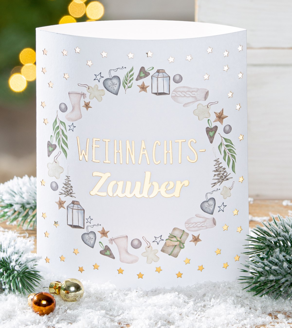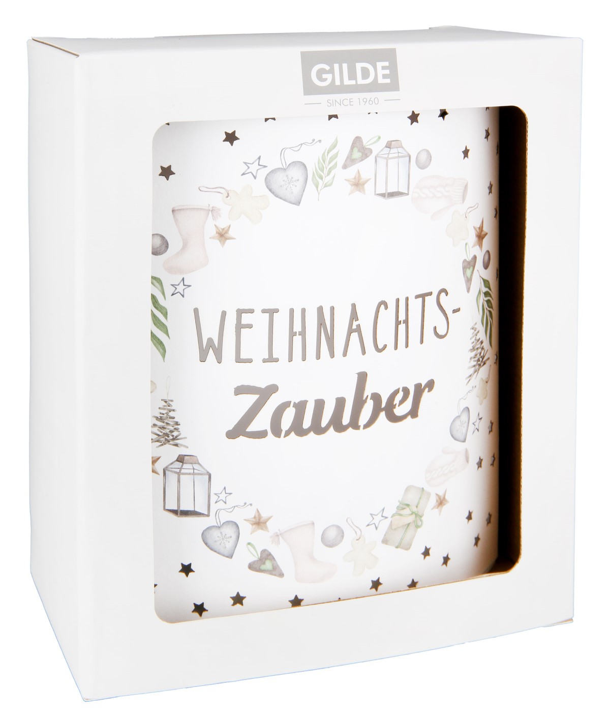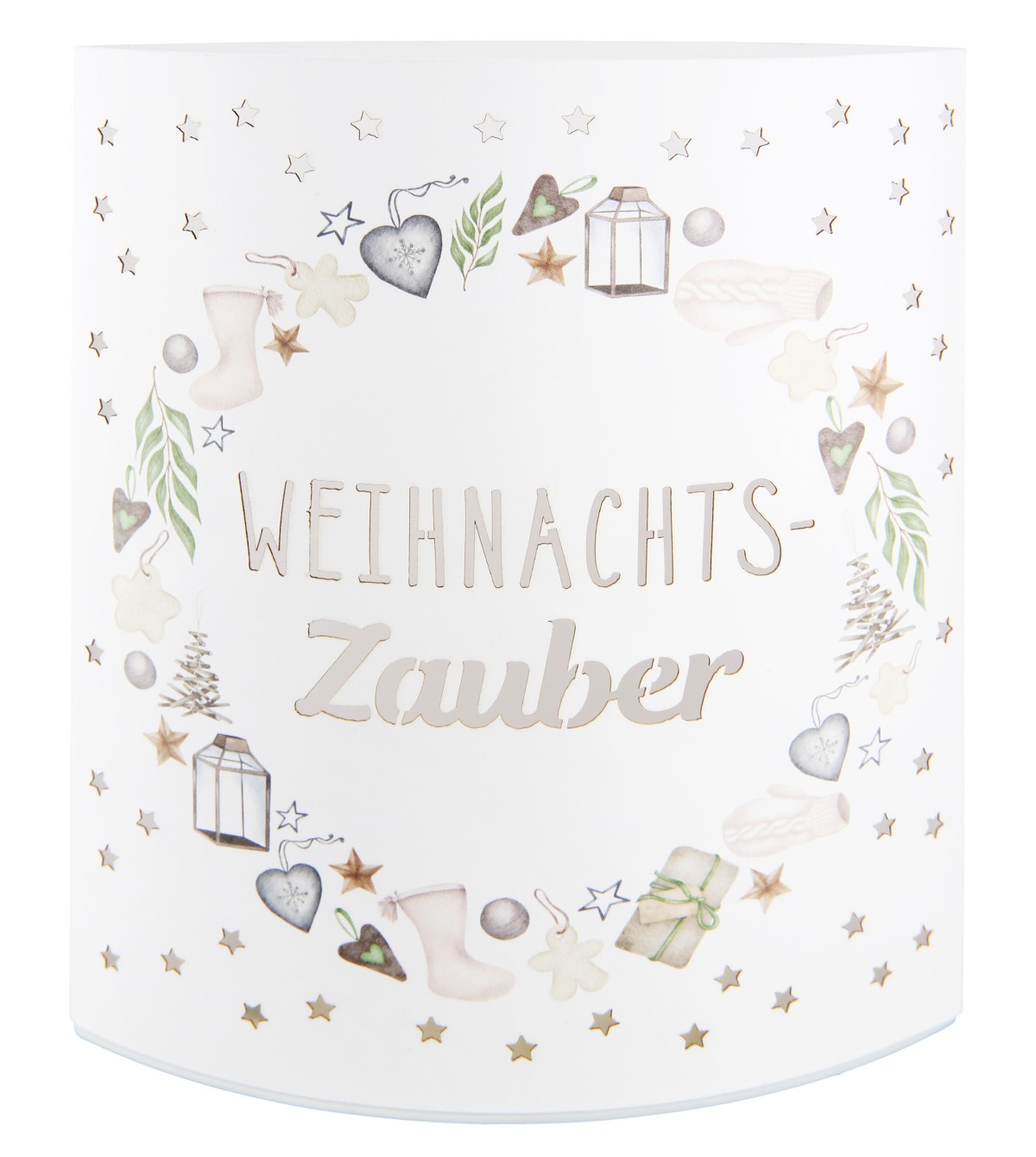 Diese liebevoll gestaltete LED-Leuchte von Gilde Handwerk macht ihrem Namen alle Ehre: „Weihnachtszauber“ bringt mit warmem Licht, filigranen Sternen und weihnachtlichen Motiven eine ganz besondere Stimmung in dein Zuhause. Die glatte Oberfläche ist rundum mit fein ausgeprickelten Sternen versehen, die beim Einschalten ein sanftes Lichtspiel erzeugen. Im Zentrum der Leuchte befindet sich ein dekorativer Kreis mit Motiven wie Weihnachtsstrümpfen, Herzen, Laternen, Geschenken und Tannenzweigen. Durch das ausgestanzte Wort „Weihnachtszauber“ in der Mitte strahlt das Licht besonders schön – ein echter Blickfang in der Adventszeit!