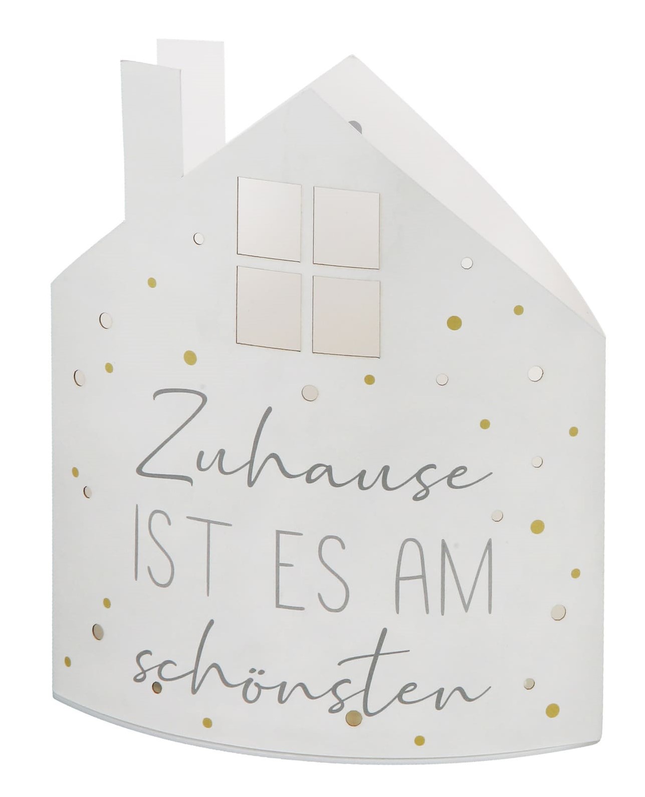 Diese liebevoll gestaltete Tischleuchte in Hausform von Gilde Handwerk bringt Wärme und Geborgenheit in jeden Raum. Die Aufschrift „Zuhause ist es am schönsten“ erinnert an das, was wirklich zählt – einen Ort zum Wohlfühlen. Die Papplampe ist wie ein kleines Häuschen geformt, mit Schornstein, einem beleuchteten Dachfenster und zahlreichen feinen Lichtpunkten, die beim Einschalten ein zauberhaftes Lichtspiel erzeugen. Perfekt für Fensterbank, Sideboard oder Nachttisch – als stimmungsvolle Deko, Nachtlicht oder Geschenkidee.