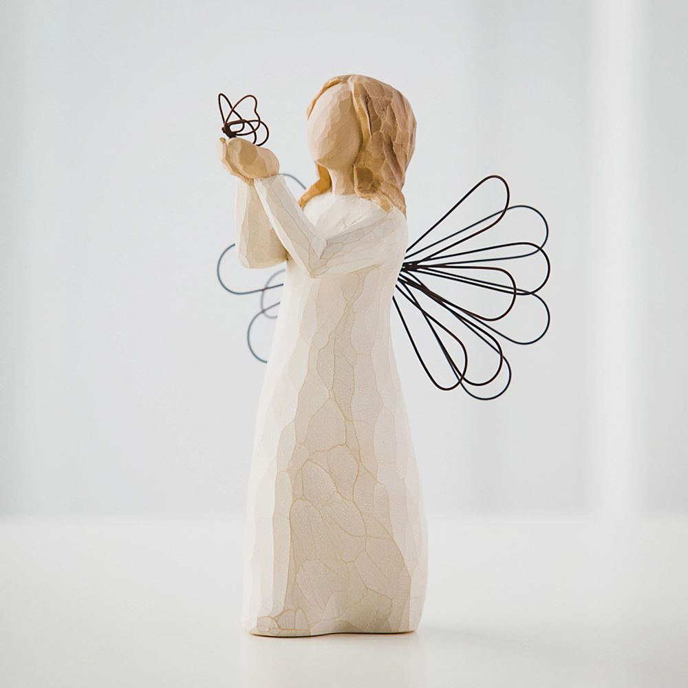 Der Angel of Freedom - Engel der Freiheit von Willow Tree fängt die Schönheit des Fliegens und die Leichtigkeit des Lebens ein. Der Engel hält mit beiden Händen sanft einen Schmetterling aus Metall hoch, was symbolisch für die Freiheit und die Verwirklichung von Träumen steht. Diese Figur ist eine kraftvolle Darstellung von Hoffnung, Mut und den unendlichen Möglichkeiten, die vor uns liegen, und eignet sich für viele verschiedene Anlässe.