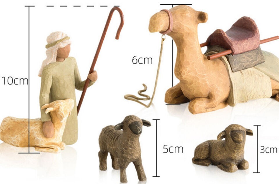 - Design: Das Set umfasst einen knienden Hirten, der einen Stab hält und mit liebevollem Blick auf die Tiere schaut. Zwei Schafe, ein liegendes und ein stehendes, symbolisieren die Ruhe und den Schutz, den die Tiere in der Nähe des Kindes erfahren. Ein Kamel, das die Reise des Hirten und der Heiligen Familie darstellt, rundet das Set ab.